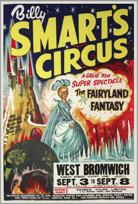 Smart’s Circus started touring at the start of the post-war entertainment boom in 1946 and was very much influenced by the American shows — particularly Ringling Brothers and Barnum & Bailey. Billy Smart called his show a ‘New World’ Circus and the advertising was one of a spectacular and flamboyant styles. Lavish Spectacles such as the ‘Wild West Show,’ the ‘Arabian Nights Review’ and ‘Fairyland Fantasy’ were staged and featured on the posters (See images 16-17).