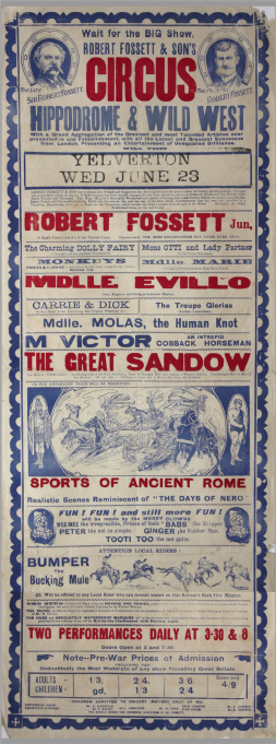 Formed in the mid 1800’s, Sir Robert Fossett’s Circus remained a steady member of the touring circus set. Best described as ‘traditional’ its style of posters reflected this approach and over the 150 years it produced posters covering all of the styles outlined above. (See image 23 above)