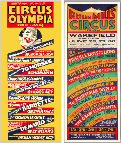 Typically for each Olympia and tenting season, Mills would commission an ‘All-The-Acts’ poster (See images 10-12) and a number of pictorial bills featuring the top acts (See images 13-15).As Bertram Mill’s Circus continued to flourish, all poster design and printing was provided by printers W.E.Berry of Bradford. Artists such as Leon Crossley and Berry’s own in house illustrators provided some of the best poster designs of the 20th Century — not only for Mills’ Olympia shows — right up until it’s last show in 1967, but also the touring Bertram Mills Circus, run by Bertram Mill’s sons – Cyril and Bernard, which tented from 1930 until 1965.In addition to the Mills show, W.E.Berry supplied the majority of ‘paper’ to the other British circuses including Billy Smart’s and Chipperfield’s Circuses, the other of ‘The Big 3’ as they were known.