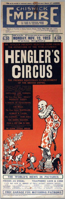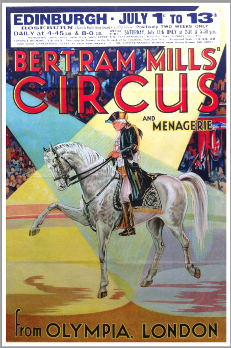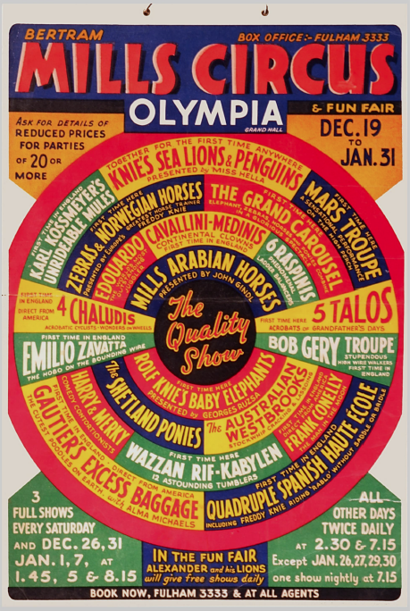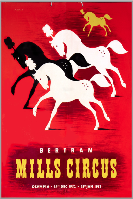 Bertram Mills Circus used an amazing quantity of posters. In 1960 alone, Bertram Mills Circus on tour, in 42 towns and cities, utilised over sixty thousand posters of varying sizes. For the London shows at Olympia up to 20 different designs were produced for each winter season and an astonishing twenty percent of the company’s expenditure was spent on poster and newspaper advertising both at Olympia and when on tour.