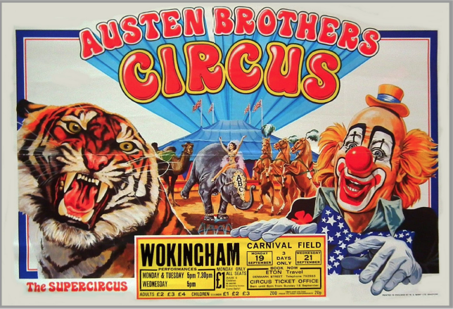 This gap in the market, however, enabled the small and medium sized shows to prosper and grow. Shows such as Robert Brothers and Gandey’s expanded and as they did their posters became more bespoke and depicted the acts and individual styles of the different shows. Initially working as a partnership, Gerry Cottle and Brian Austen, along with his two brothers Michael and Patrick, went on to tour as Gerry Cottle’s Circus and Austen Brothers Circus respectively. The style of both of these shows was very individual and was reflected in the posters and other publicity material (See images 21 & 22).