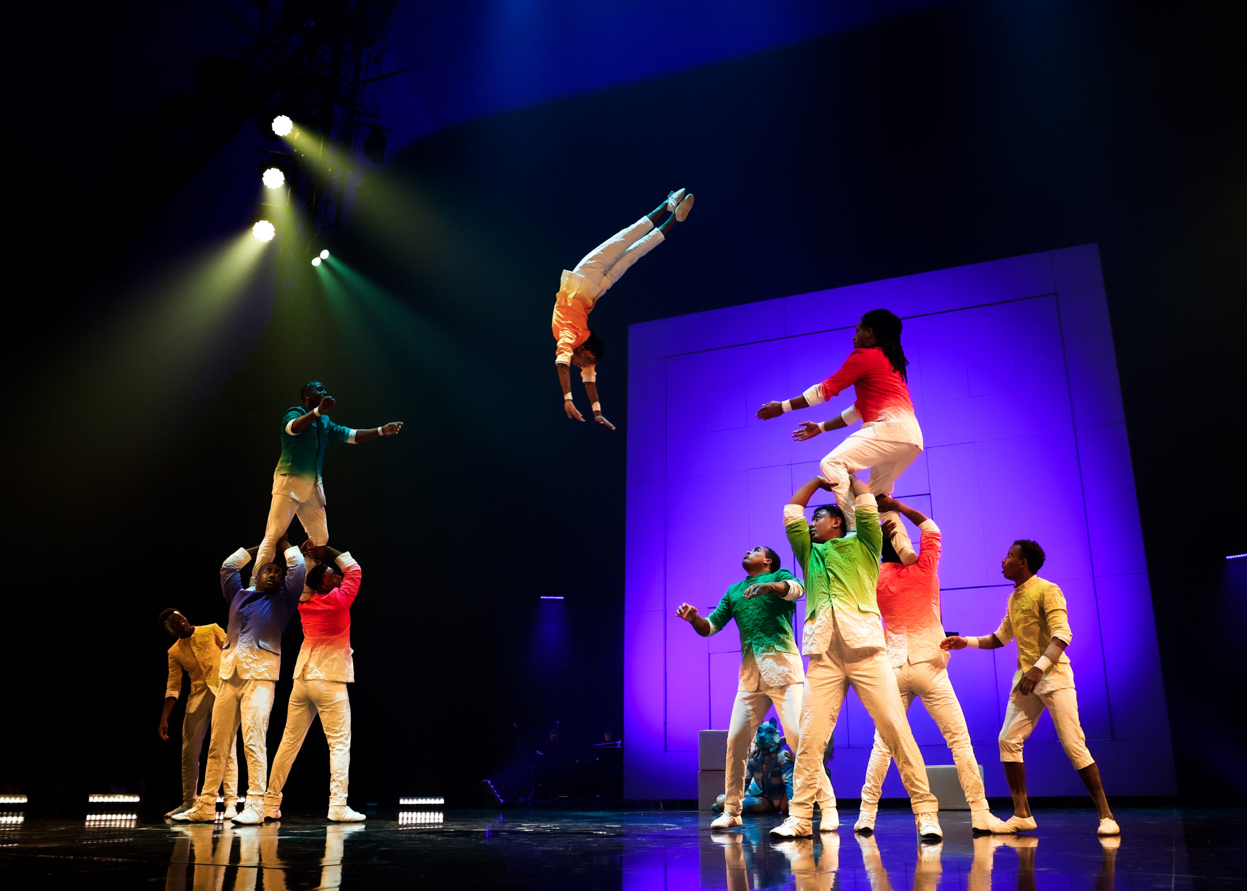 Echo’s acrobatic repertoire, dense and versatile, unfolds itself as a dynamic and poetic inventory. By slipping from slackwire to the Washington trapeze, Icarian games to teeterboard, and straps to hair suspension, Echo assumes a principle of classical composition, like multiplying the notches in a woven cloth, flexible enough to tighten as the show moves between attractions. The rigorous juxtaposition of dissimilar forms is Echo’s keystone. Its range of disciplines, welded together by the neutral surfaces of both the stage and The Cube, functions to create a true aesthetic syntax. Echo is a formidable illustration of the idea of demystifying what is secret, a very ambivalent notion within the formal context of classical circus. From one sequence into the next, the space reinvents itself before the eyes of spectators, constantly creating new visual perspectives—new landscapes where the purity of white is only a temporary means to conceal a new explosion of colors.