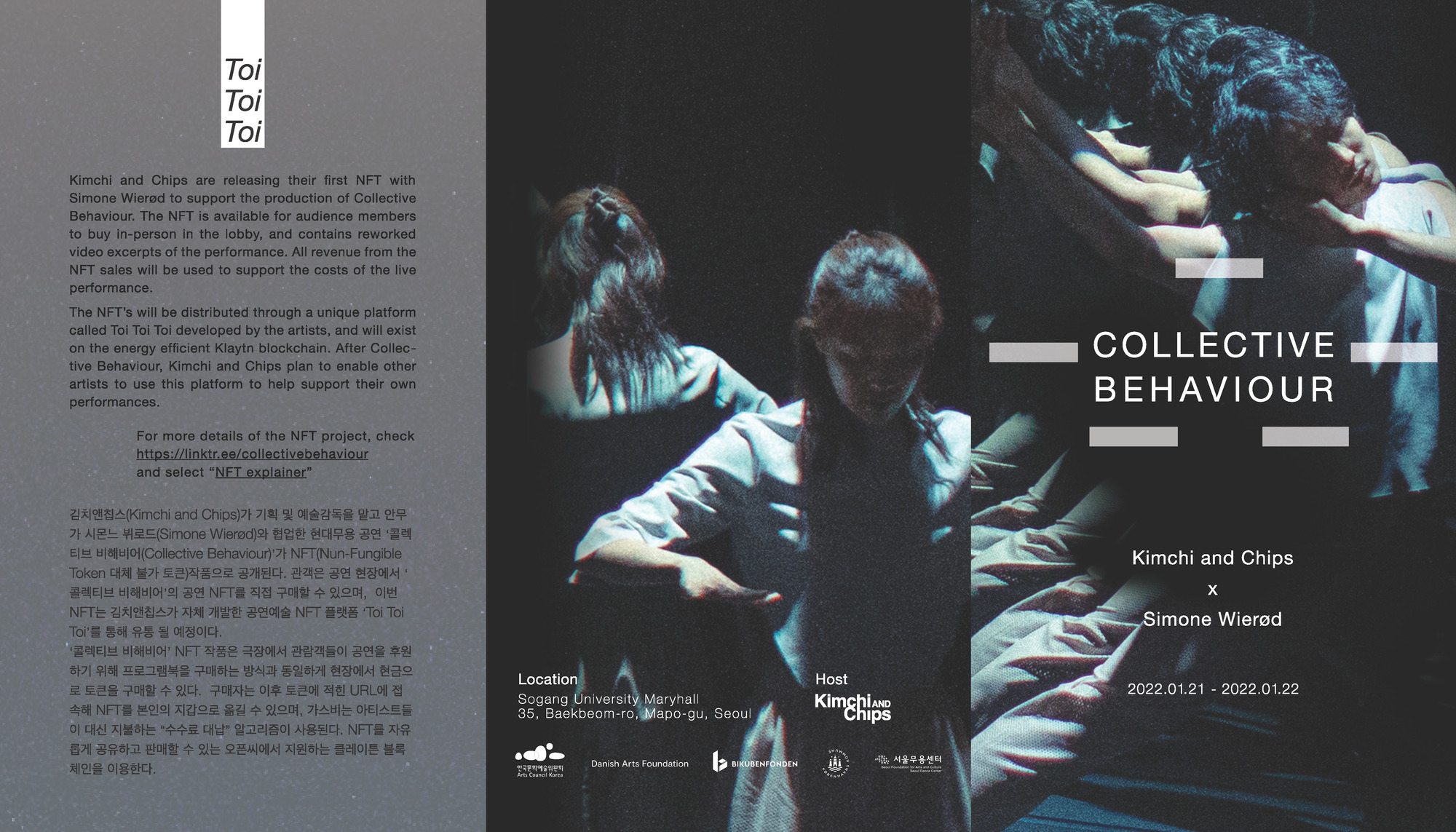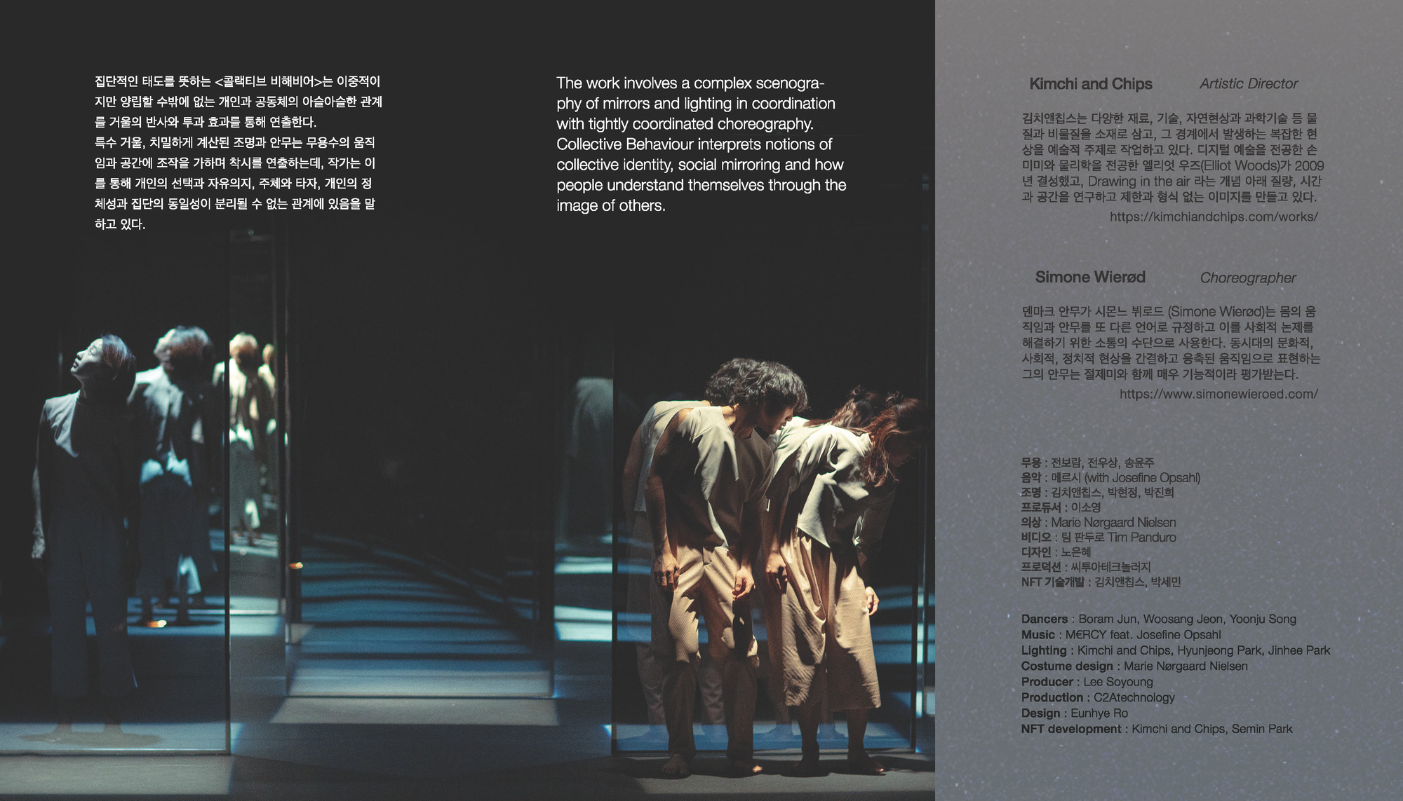 There were clear benefits offered by the Collective Behaviour NFT project. There was an obvious financial benefit, as the NFT sales partly funded the tour, and a marketing benefit, as the novelty aspect attracted increased interest in the physical performances. The project also contributed to establishing a dialogue with South Korean audiences and creating a digital community around the performance. The possibilities of leveraging this type of committed digital community, who have already invested in your artwork, is something Simone Wierød wishes to explore with future projects.