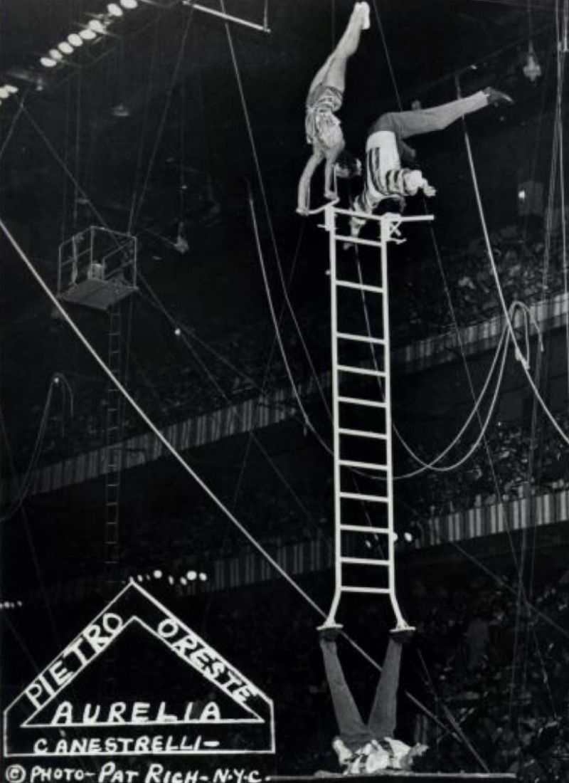 The American circus world lost a matriarch this month. Aurelia Canestrelli Nock grew up as part of Italy’s famous Canestrelli circus family and came to American at the age of 19 to join Ringling Brothers Circus with her family’s unsupported ladder act- where one uncle balanced a tall ladder on his feet as Aurelia and another uncle climbed up to do tricks on it. Growing up in a circus family, Aurelia performed many acts including acrobatics, low wire, aerials, and bareback riding!