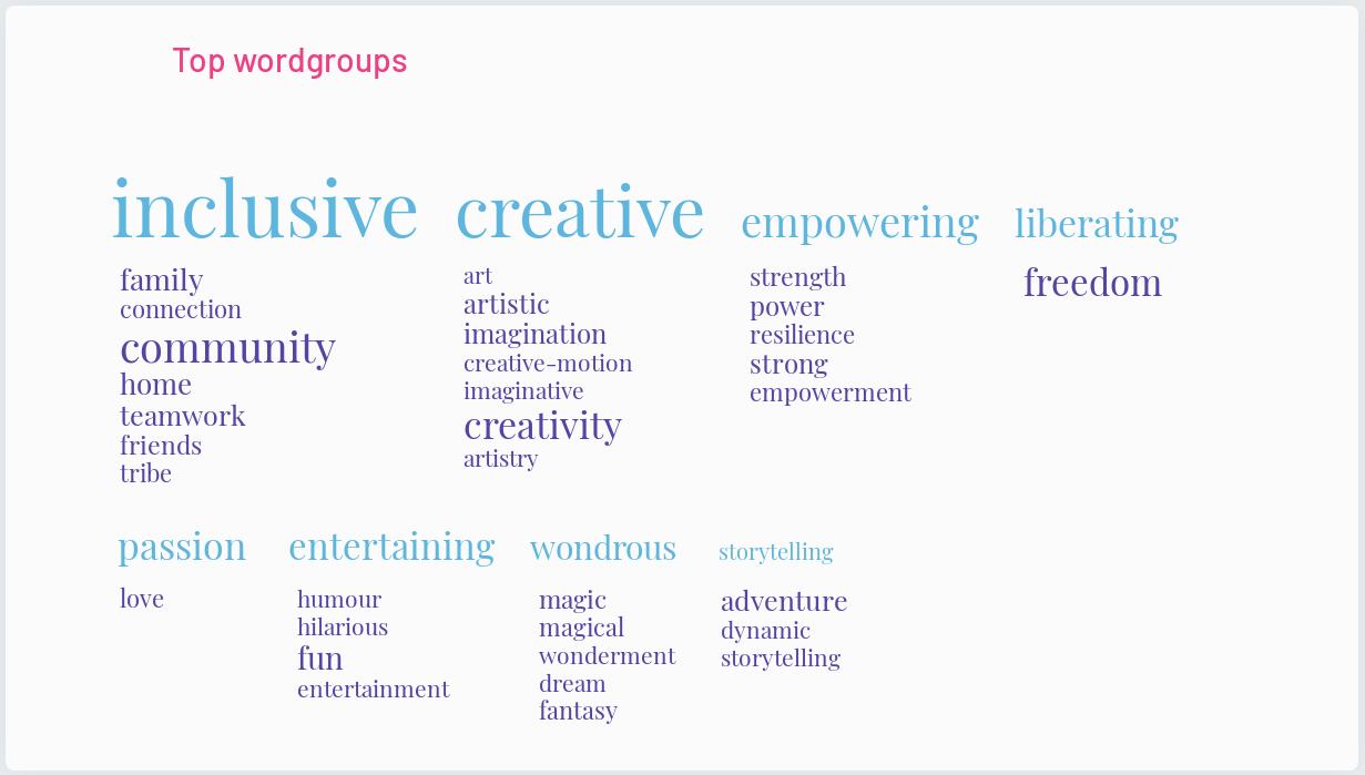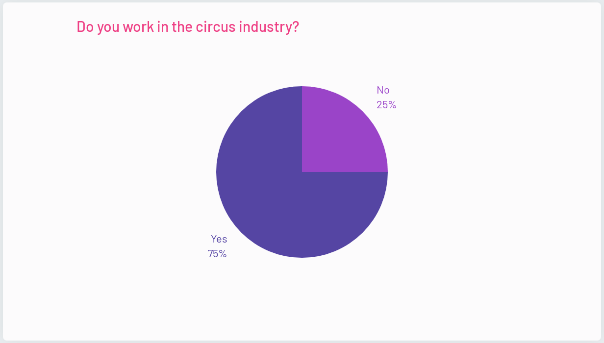 What surprised us about the response? How is this information valuable for us? The affirming message of the data is not entirely surprising, after all, circus is often lauded as a joyous and expansive means of expression, especially by circus professionals–but what is interesting is that not many of the answers had negative connotations, which indicates that the majority of people, professionals and non-industry members, have positive impressions of circus as an art form, a fact that could be of interest to government arts funding bodies around the world.