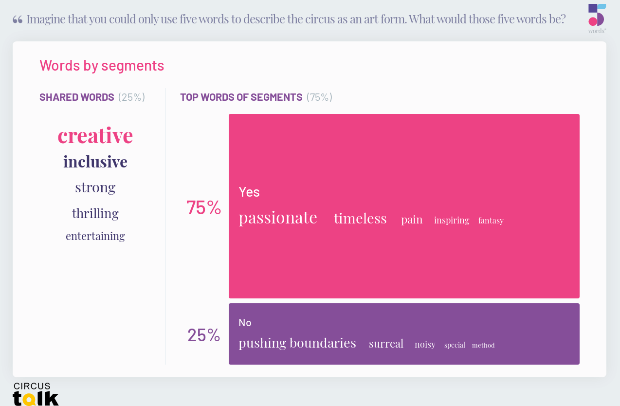It is difficult to sum up a whole art form in 500 words, let alone 5, but by streamlining our concepts, it can lead to some surprising insights about the circus sector. That is the idea we had when we decided to try the new initiative 5-Words, a website meant to help public speakers, educators and business people by compounding the visual data around a concept, using pie charts and word clouds, which are always the most pleasing infographics to behold. We asked 5-Words how a tool like this could be used by artists and circus companies to understand their business or audience better.