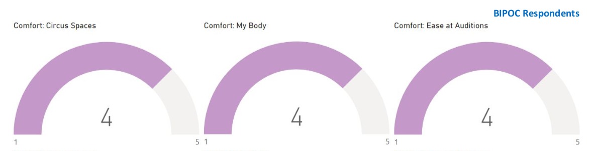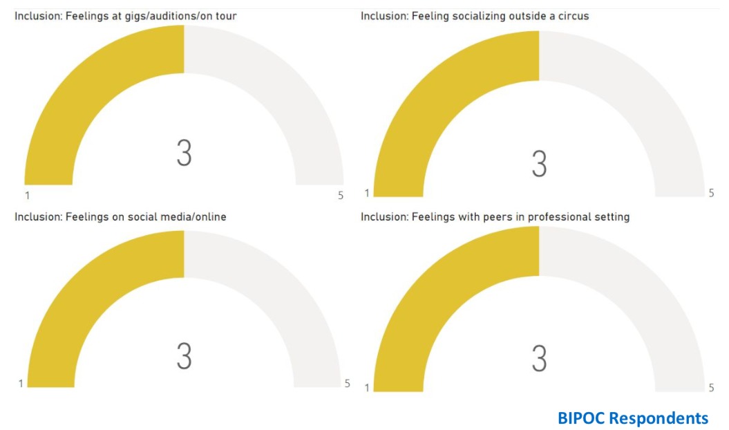 BIPOC Respondents also scored lower in feelings of inclusion while socializing outside of circus, in social media, and with peers in a professional setting.