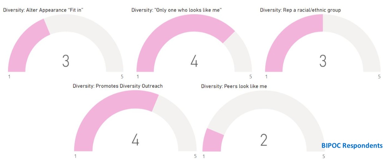 The “Diversity” question represented the largest difference between groups. BIPOC Respondents scored higher (agreed more) in altering appearance to “fit in”, being the only one who looks like them, feeling that they represent a certain racial/ethnic group, and scored lower (disagreed more) in having peers who look like them.