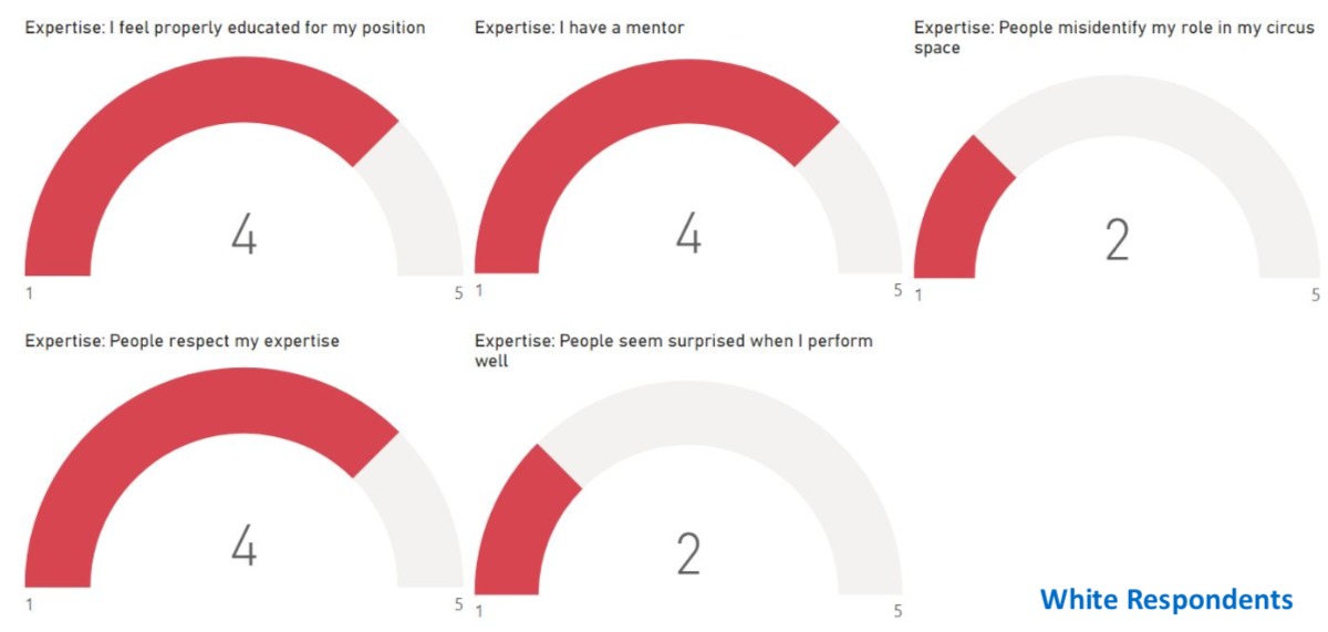 The “Expertise” category saw no change in most questions but one (a 3 compared to a 2): that “people seem surprised when they perform well.”