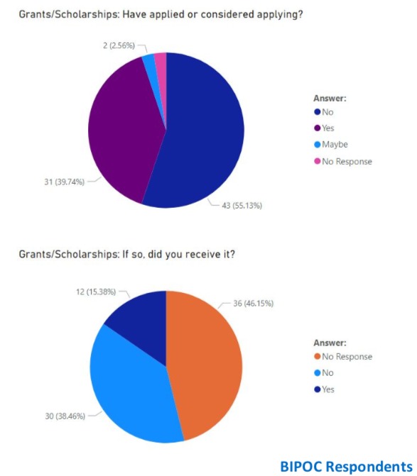 In terms of Grants and Scholarships, out of the 47% of white Respondents who have applied for Grants and/or Scholarship opportunities, 28% have received them. Out of 40% of BIPOC Respondents who have applied for Grants and/or Scholarship opportunities, only 15% have received them.