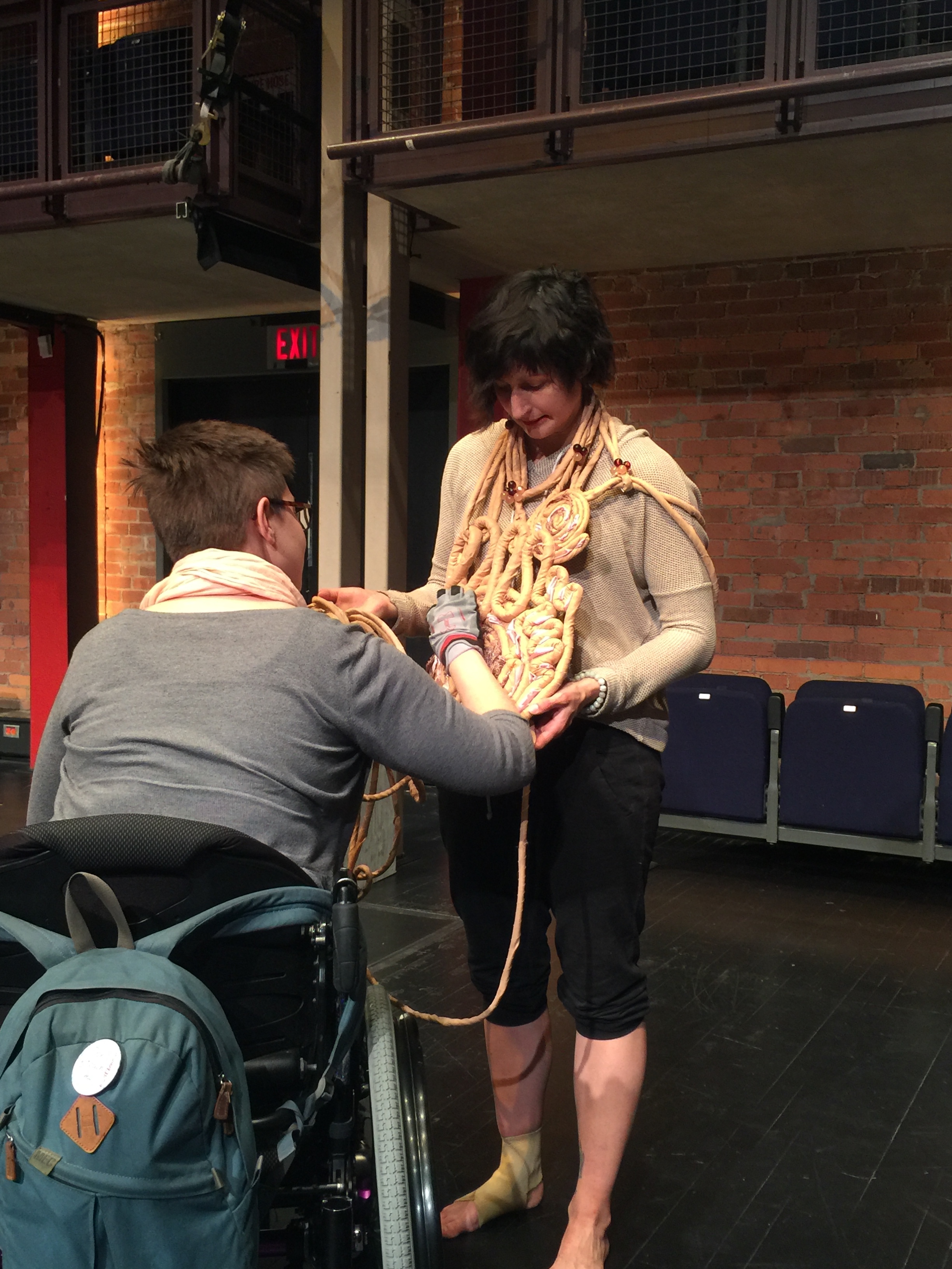 Prior to each showing, the doors opened early for those who wished to participate in a touch tour. Participants were greeted by a stage replica built out of straws, netting and pipecleaners, with bits of silks attached. They were encouraged to touch this replica, and even experience the changing height and interchangeability of the center apparatus. This replica allowed participants to gain an understanding of the space, and begin to develop a mental image of the room they were walking into before they entered the stage. Ball’s legs were one of the items explained to participants, including an introduction to the sound that they make when she walks, so they could place the sound during the show.