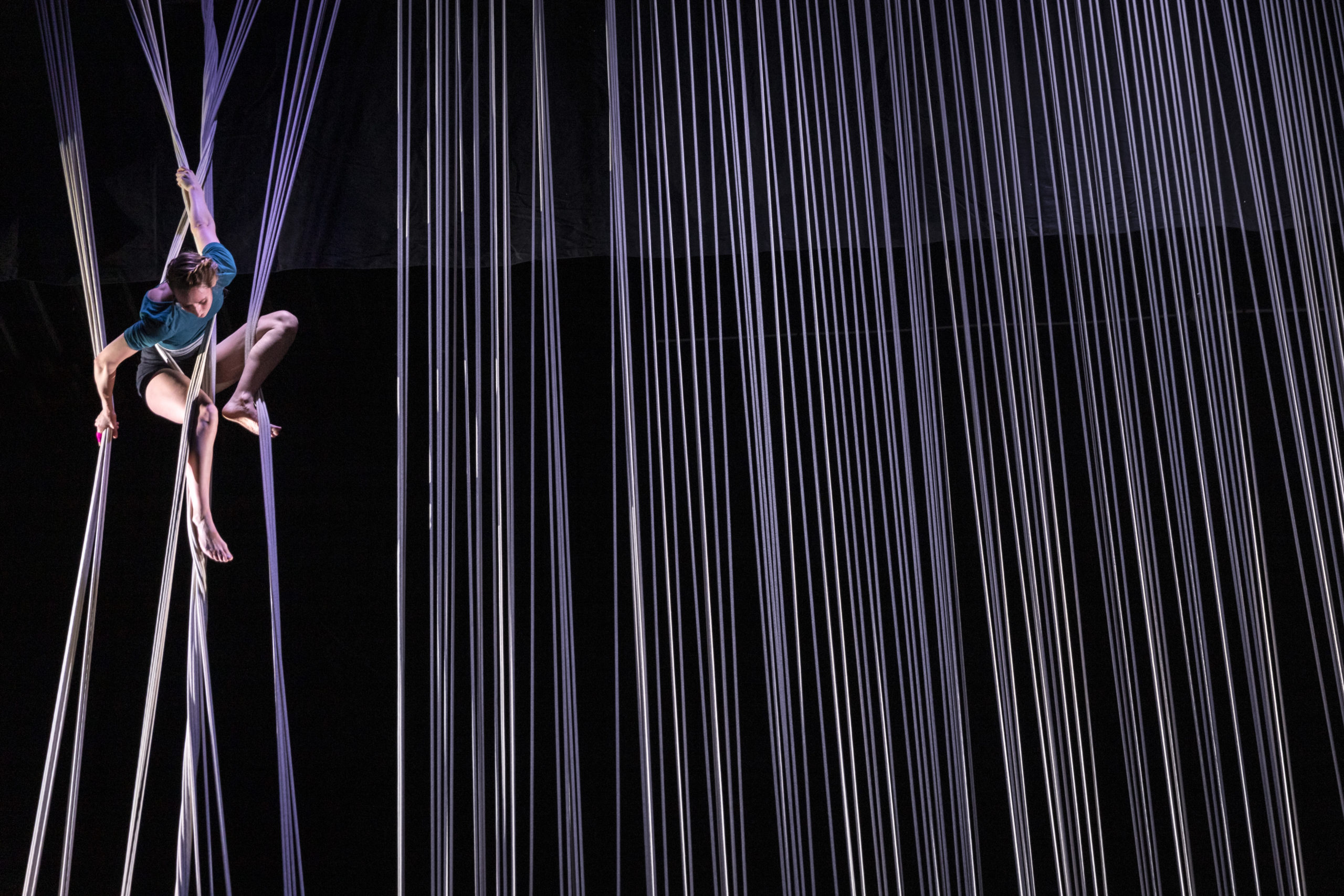 Saar Rombout is a circus artist and creative rigger, specializing in triple cloudswing, vertical dance, and rope design. She uses her own installations as a rope discipline to move with and explore connections. Rombout relies on her experience with creative rigging to incorporate play into her work.