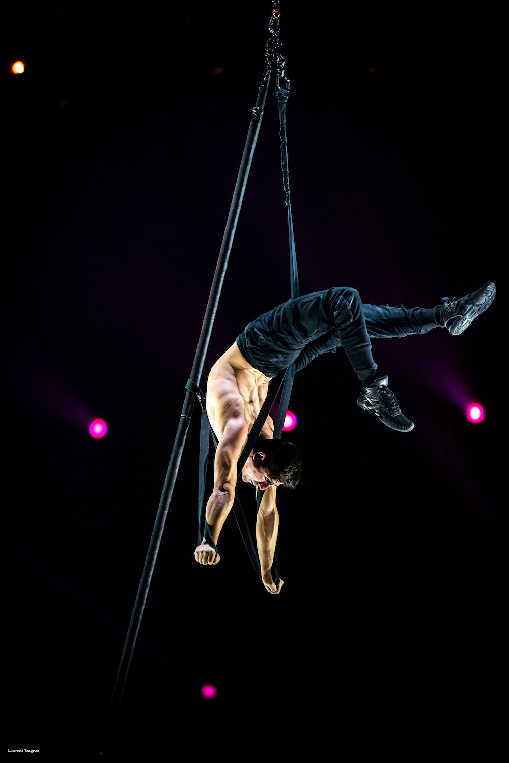 The festive spirit in the crowded Phenix big top is peculiar; nowhere else does an audience formed by thousands of circus students from around the world cheer like a football stadium crowd for their peers and idols onstage, met with reactions far from the standard circus show (the closest comparison being perhaps from the golden age of the Ringling Bros. Circus’ arena tours). This exchange of electricity is strengthened by the organizers’ fidelity to a few classic codes of circus. The ring is evoked by the central performing space of a black elevated square: a welcoming, neutral monolith synthesizing the multiple spatial identities of actual circus. Red velvets are an essential remembrance of the ceremonial side, as is the live band of Francois Morel, lending their support not only to the finales and transitions but also several of the acts; the parades; and the flamboyant emcee, Calixte De Nigremont, that the audiences have adored for years. Flags and smiles are everywhere, shining under the rainbow of a most impressive lighting system.
