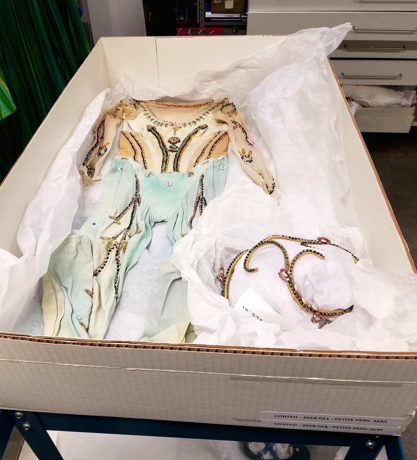 As we enter the vault, you can feel a change in temperature. Since the goal is to maintain costumes for conservation, the vault is held to preservation standards, where temperature, humidity, and light are closely monitored and controlled. The room contains rows and rows of rolling shelves which the preserved costumes are stored on. Although most of them are stored in boxes, some that are too large to fit in a box are stored hanging. The hanging racks are a diverse explosion of colors, shapes, and textures.