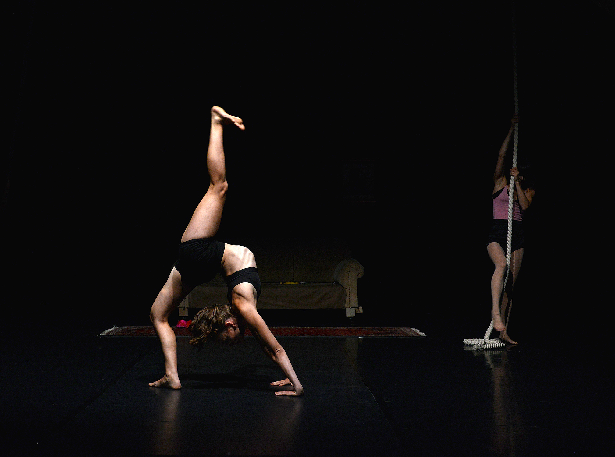 Produced by Chamāleon Productions, the all-female collective Still Hungry of Berlin has created a spectacular show that gets all of the elements just right—love, strife and a dash of outrage. Anke van Engelshoven, in the midst of caring for her newborn child, enters a dream sequence where she reminisces about the days of smoking, going out until 3am, and dancing unfettered by any cares or responsibilities. In a powerful cinematic scene, she speaks of her longing for those days while donning a sequined outfit and a fringed up jacket before she climbs the rope and turns out a badass act to a powerful house music beat. Does the rope give her those moments of youth and freedom back?