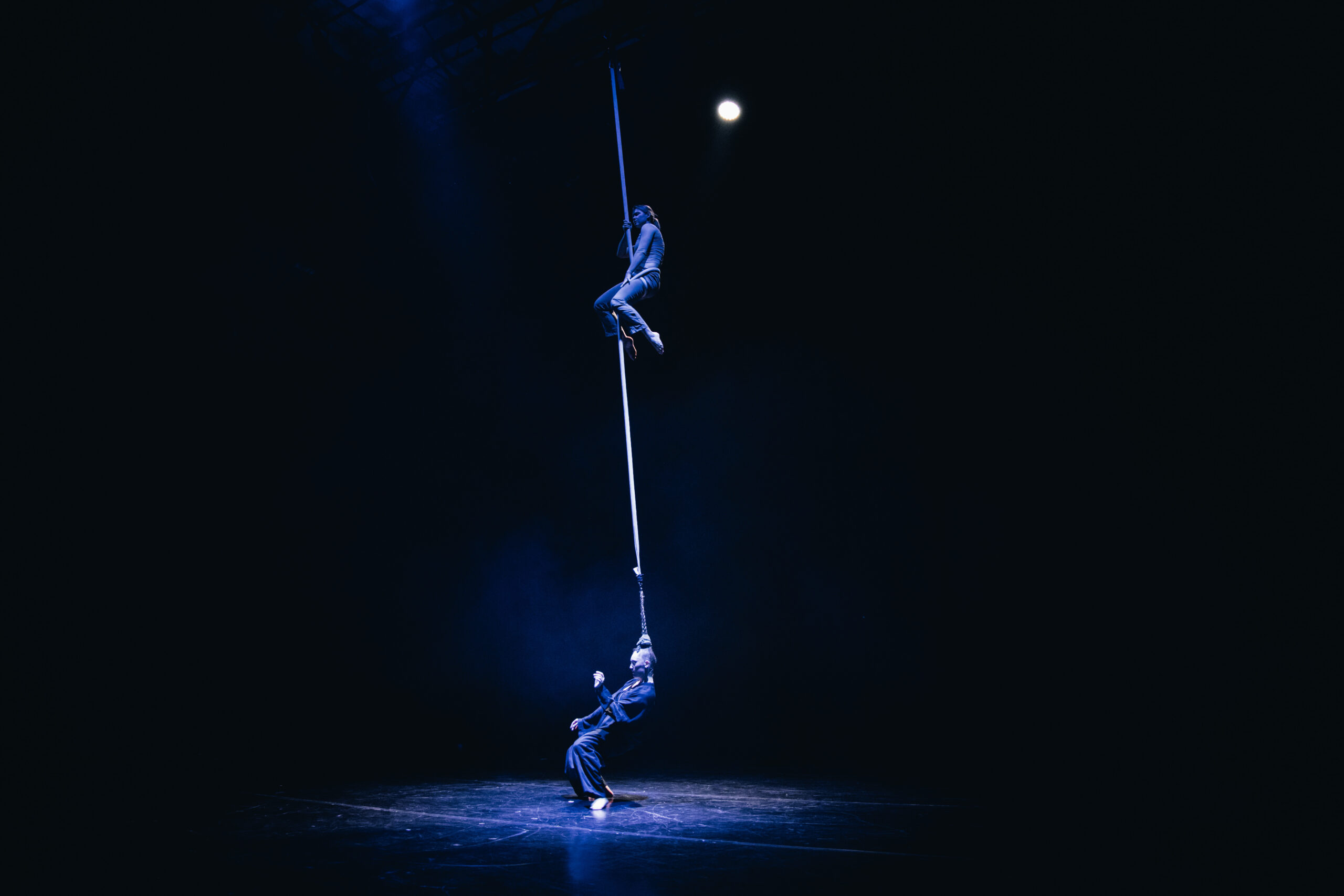 Lithuanian-based contemporary circus company Taigi Cirkas presented their first full-length showUp to this Point, performed by Konstantin Kosovec and Alexey Smolov, and a work-in-progress of their new creation “inTENSE,” executed by Konstantin Kosovec and Izabelė Kuzelytė, at Epicirq. The main figure of both performances is a complex hanging structure made of rope and other materials. Watching their shows gives the spectator the experience of observing a circus artist’s playground. The whole dramaturgy usually revolves around solos for artists attending their disciplines and an acrobatics sequence performed by everyone on stage. I would propose that Taigi Cirkas performances are non-narrative contemporary circus because, as I mentioned before, the performance structure is highly fragmented, and usually there is hardly any detectable relation between the artist duet and the monumental structure; therefore there are no characters to identify with. It is rather a spectacle that derives from the true origin of circus and its core purpose to entertain.