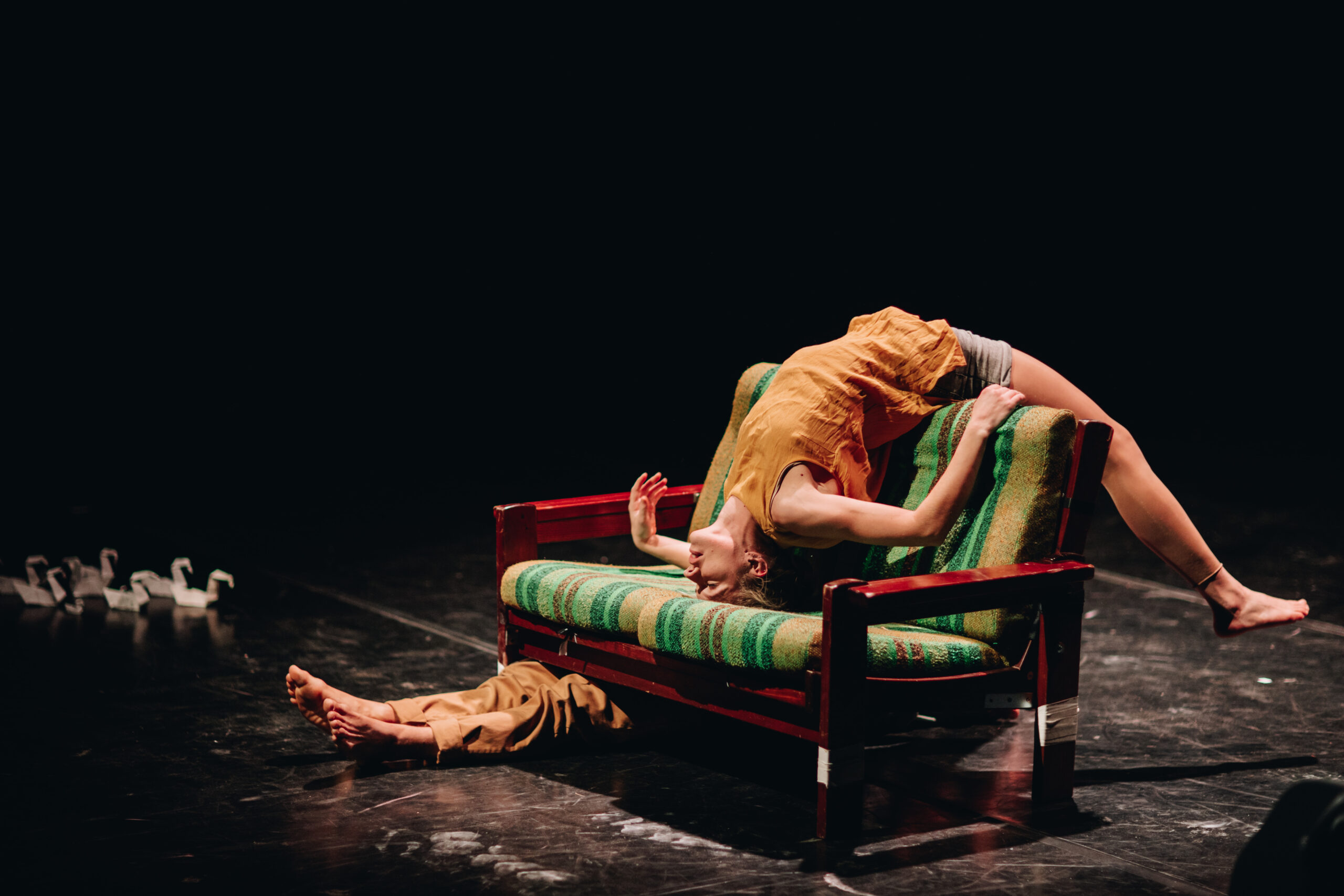 The idea for Lizeth Wolk’s (EE) and Alexey Smolov’s (LV) duo pieceNot to be Mentioned came from wanting to explore the personal side of single parenting and its effects on adults who experienced it. Both of these artists were raised by only one parent. Throughout the show, they mostly concentrate on the topic of loneliness, introduced by an acrobatics sequence involving a sofa. The two artists do hand-to-hand, object manipulation, and acrobatics sharing the same sofa which is a clear representation of the day-to-day routine by not interacting with each other at all. They move tremendously close, but their bodies always slip through in relation to one another. In this state of emptiness, Lizeth and Alexey find themselves in a never-ending search for answers. The audience is not astonished by high-level circus tricks on stage, but it is not expected, either. Circus is a mirror helping to reflect personal experiences for the two lonely souls surrendering to the unknown accompanied by only the reassuring memories of the popular tunes which have become a sign of the times they grew up in.