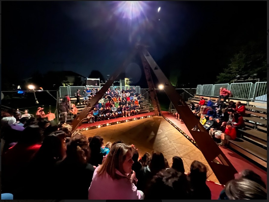 In the triangular center ring, three ten-meter-high metal beams form a pyramid flanked by bleachers. The three protagonists question our complex relationships with power, asking: “Power is only an illusion – isn’t the best way to preserve to destroy those who covet it?”