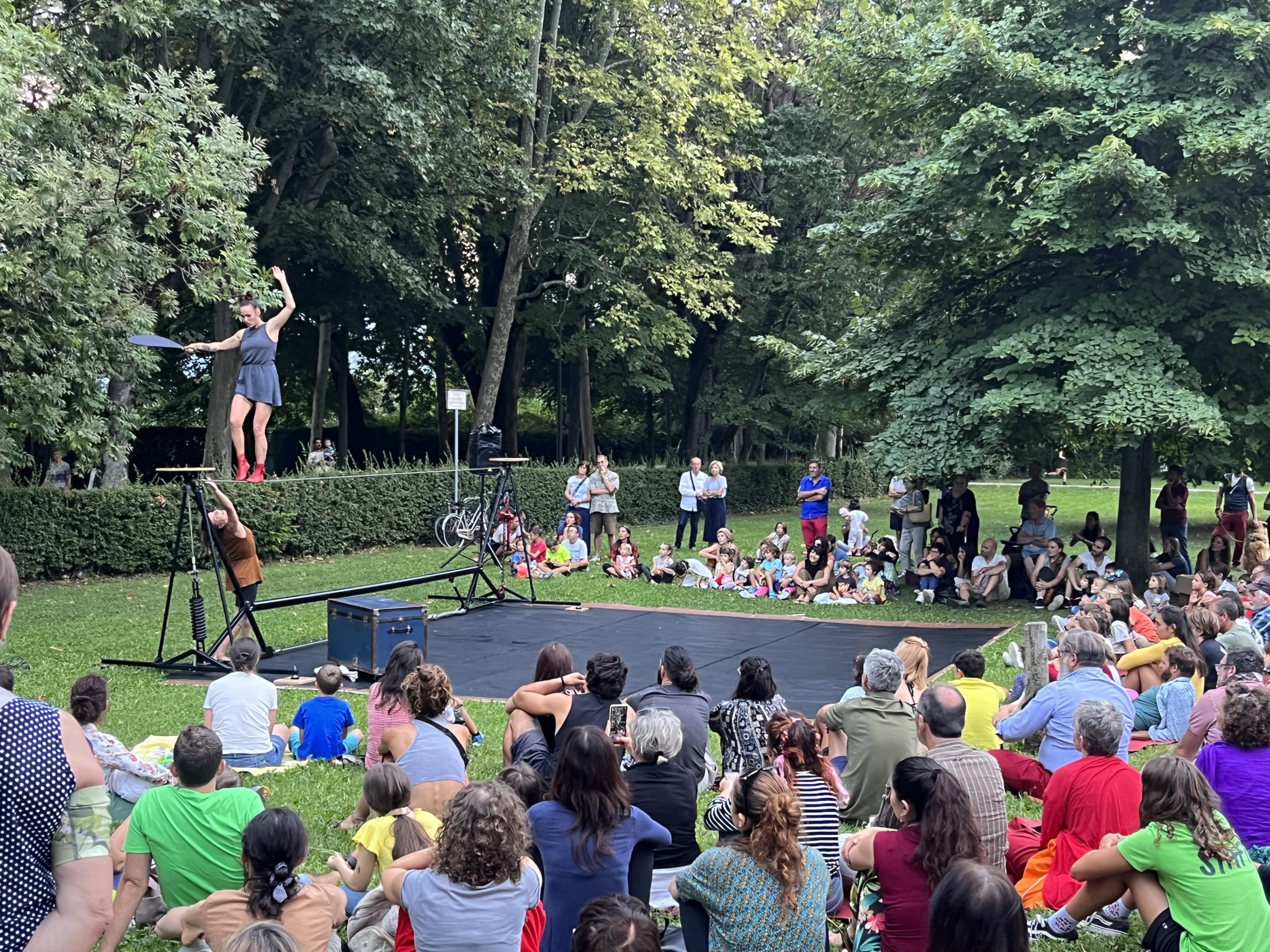 Moving once again to the outdoors, in the same giardini not far from the CirkVOST stage, the female duo Circo in Rotta performed Tienimi Che Ti Tengo, a blend of contemporary dance, juggling, and wire walking that recounts friendship and feminine strength. Though likely designed for an indoor stage, I took delight in watching the audience sit, engaged, under blue skies. Dogs on leashes sniffed the grass and cyclists on the bike path “backstage” stopped to watch. Live arts for all.