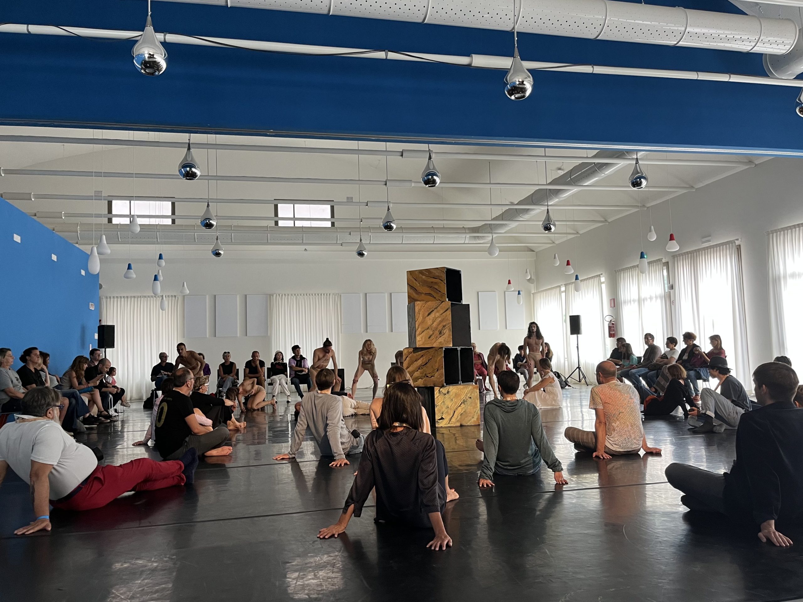 Eartheart, a performative installation by Compagnia EgriBiancoDanza, was presented in the auditorium of Varco, a modern building typically used for music production, audiovisual production, and photography. I was among the 20 or so people who volunteered to “participate,” not knowing quite what was involved. Turns out it meant sitting on the dance floor with a small speaker slung around my neck, while dancers costumed in nude-colored apparel and fishnet stockings performed all around and even over us. The immersive piece considers the audience an active part of the performance, at once present and not present, helping to determine the modulation and constant reshaping of the space, sound, and choreographic patterns.