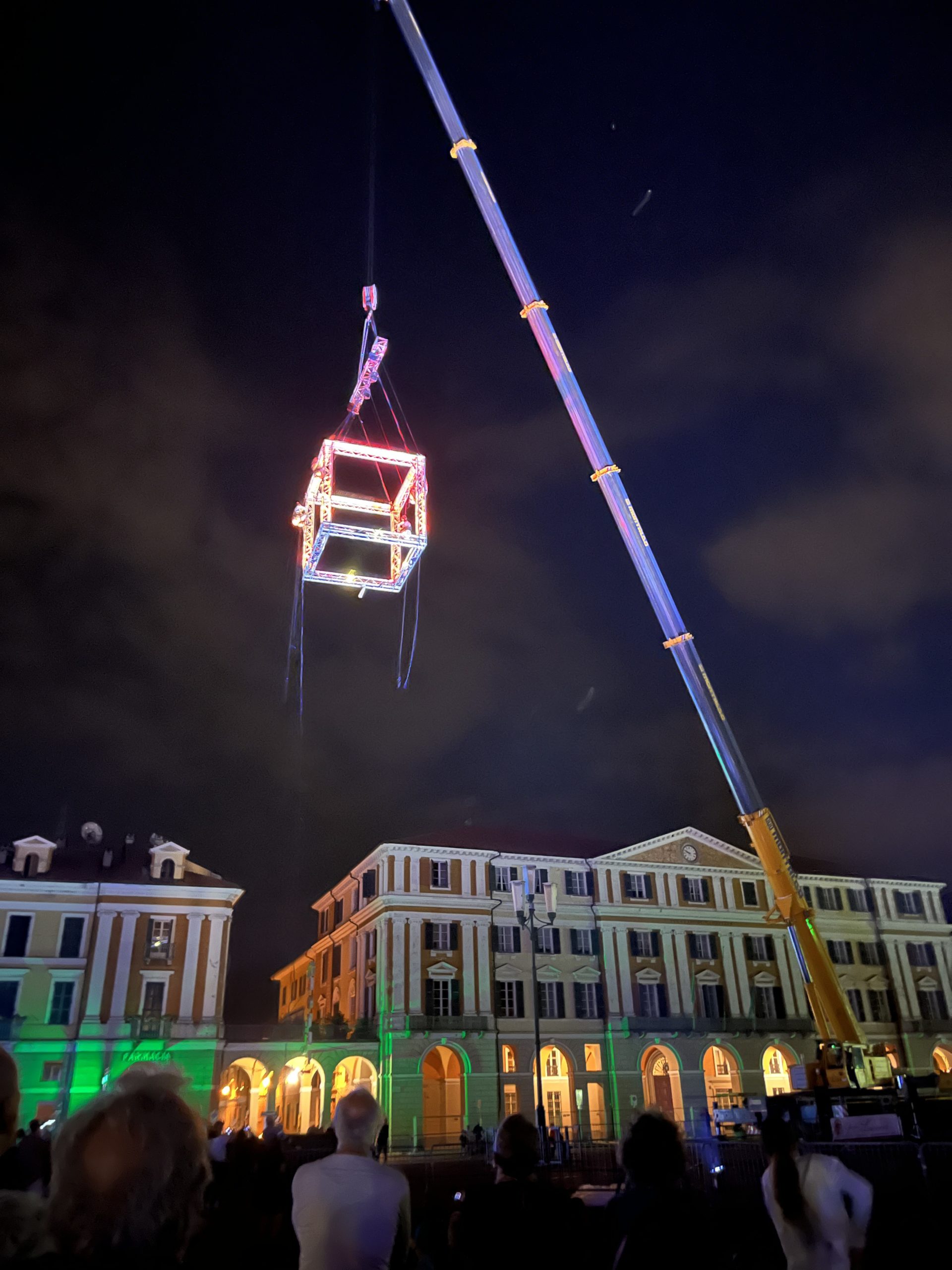 eVenti Verticali lit up Piazza Galimberti with Cubo, an immense aerial truss structure shaped like, you guessed it, a cube. The three-dimensional, brightly lit aerial stage rises and lowers in space, courtesy of a crane. The moving bodies, attached with ropes and harnesses, dance in all dimensions, creating spectacle theatre in the air. As with Moby Dick, the piazza was packed with spectators young and old, and the towering structure could be seen from the apartment building windows and restaurant patios lining the square.