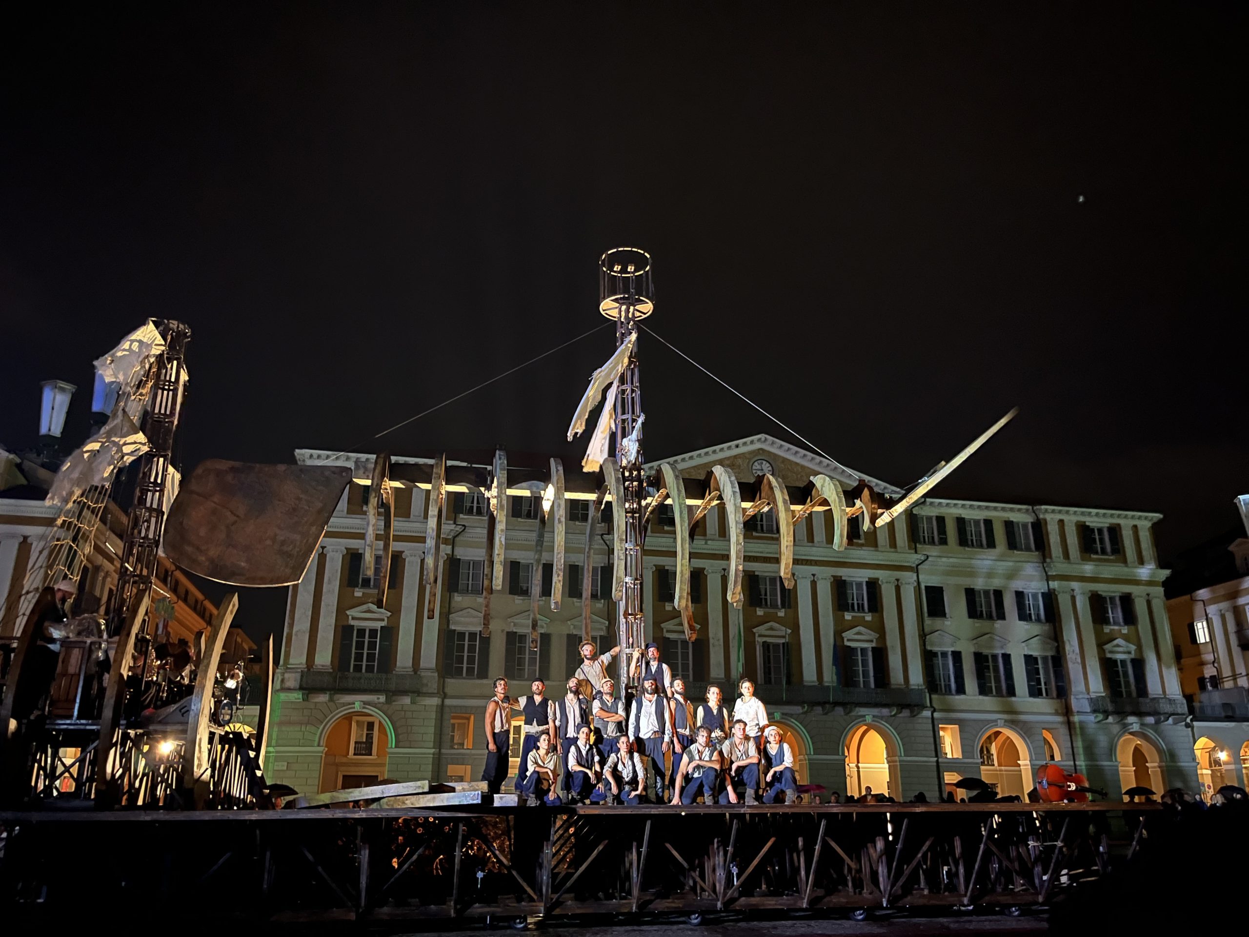 I saw Teatro dei Venti’s Moby Dick on the one evening when it rained—hard—in Cuneo. But not to worry; the inclement weather did not discourage the open-air audience, and even added a dramatic (albeit slightly hazardous for the acrobats) element to the staging of an urban spectacle theatre experience in Piazza Galimberti—one that begins with “the square… empty, suspended, breathing. It is waiting.”