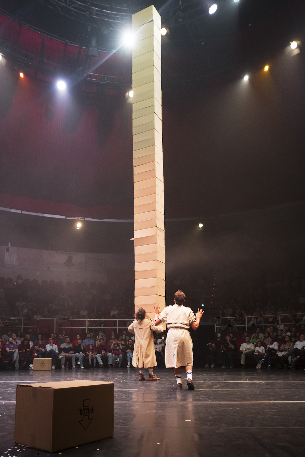 Cíe Soralino (Brazil, France) A juggler, an acrobat and… a lot of cardboard boxes. A risky and comedic act where no audience gaze ever leaves the stage during the whole act. The performers explained that in their research they wanted to join street art with the art represented in theatres, and Soralino found a personal, different and amazing result.