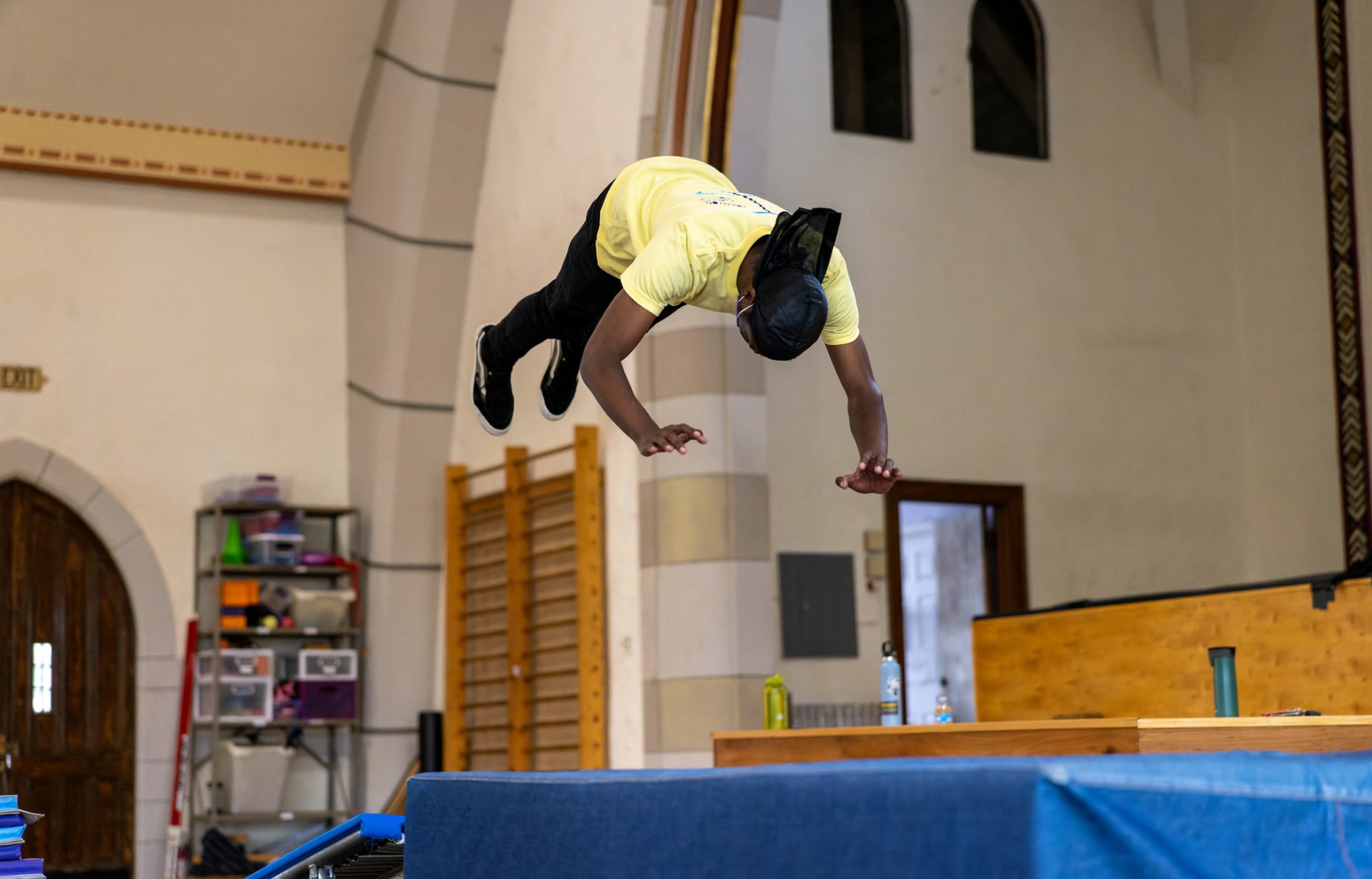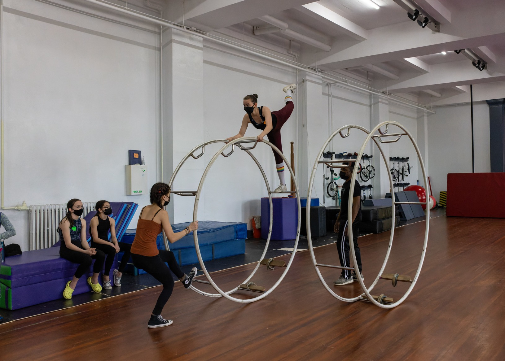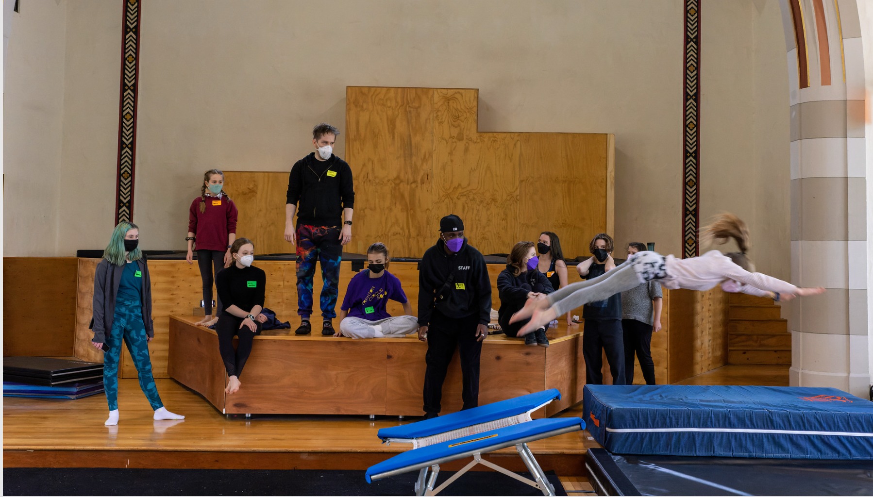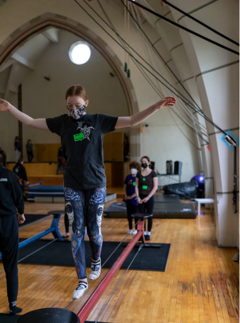 In addition to giving participants the chance to learn new skills and perform for each other, the festival brought the greater circus community together and connected young circus artists with their peers, some for the first time. Not surprisingly, the Covid-19 pandemic has caused significant disruptions to AYCO’s youth festivalsover the past few years, and as a result, this was the first in-person iteration of the event since 2020. This year’s festival was exemplary in many ways of our collective “new normal”: participants and instructors wore masks at all times in the building, and the check-in process also involved Covid testing provided on-site. Every single person involved in the event—coaches, students, chaperones, and administrators—was tested before starting the day, ensuring that everyone could enjoy the event safely. Meals and breaks happened outside to give everyone a chance to unmask for a time and take in the grounds of the campus, where entertainment was provided by on-site wirewalking and flying trapeze artists.