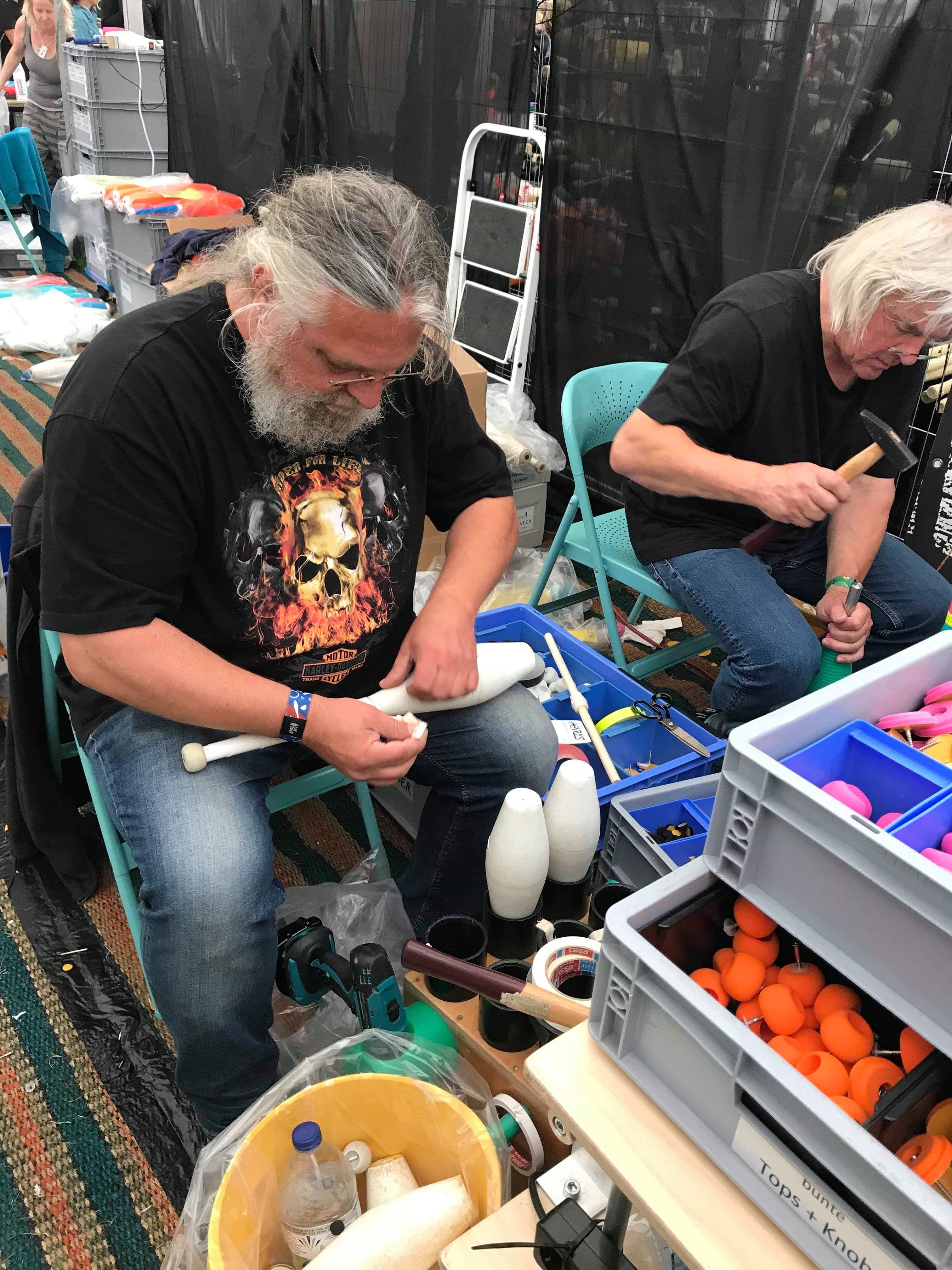 Henry’s is best known for their clubs especially, but also for their diabolos and yo-yos, They also manufacture beans bags and balls now. Meyer described how they send their distributors all of the parts for the clubs and diabolos, and teach them how to put them together, because the trend for customized multi-colored clubs makes it difficult to stock every option. He demonstrated how he puts together a Henrys club, showing me the ash wood dowels as he fixed a huge box of used clubs people had dropped off for repair, set between him and Henry. Both founders spent the majority of their 10 days here at the workshop seat repairing and sprucing up old clubs for free.