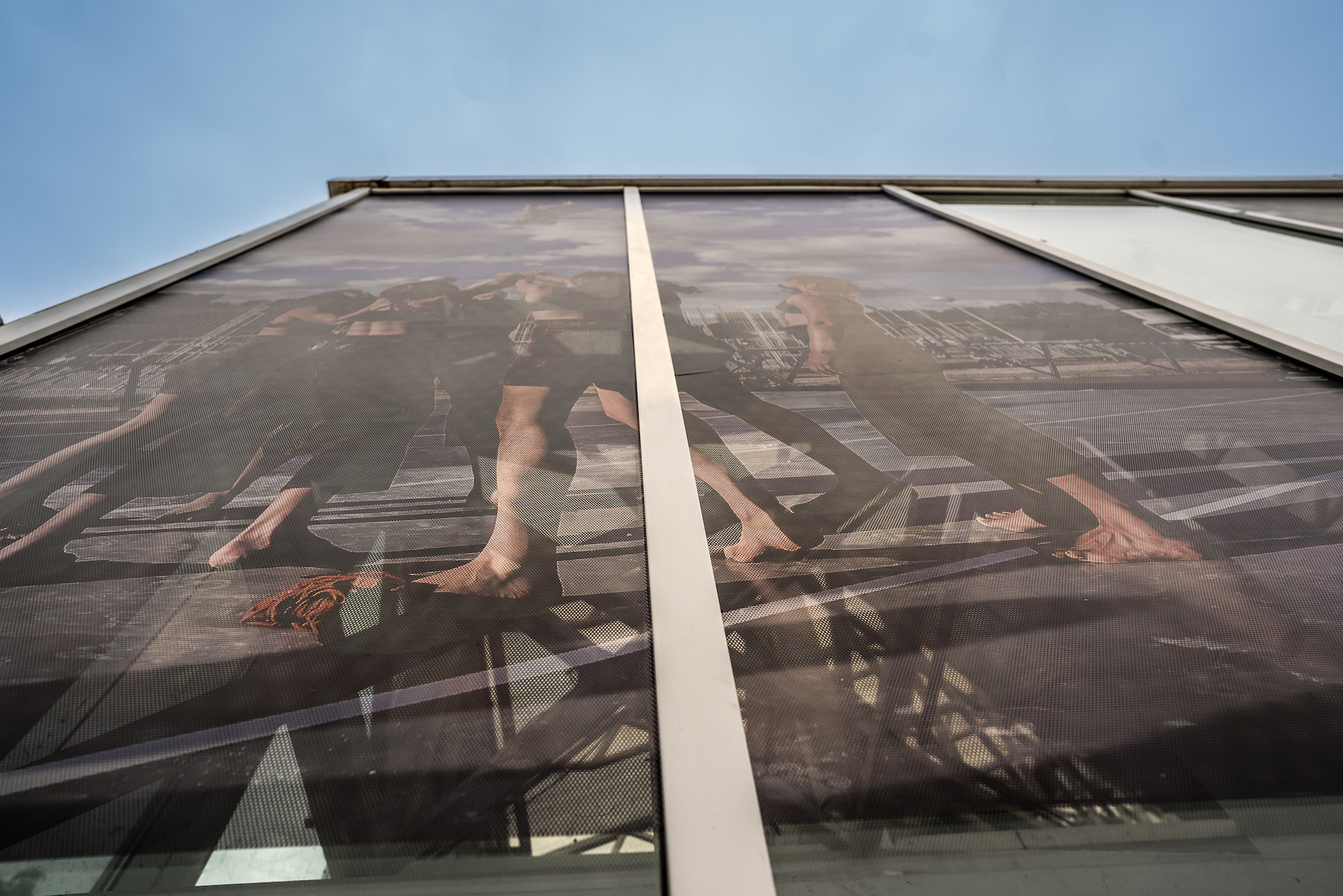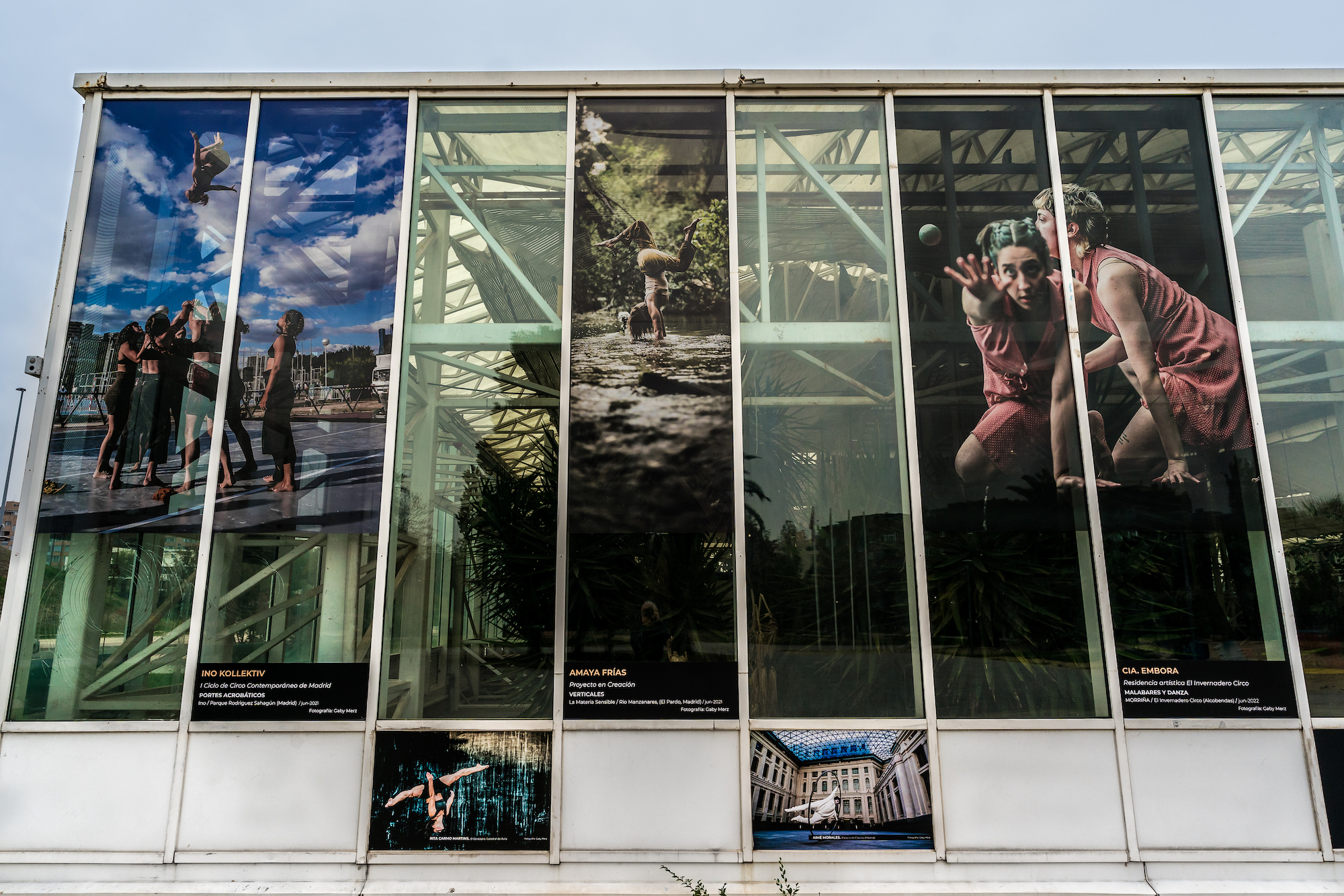 Invernadero de Circo is a photography exhibit by photographer Gaby Merz designed specifically for El Invernadero, a circus school and professional circus training and residency space. The exhibition conveys the great wealth and variety of today’s circus through 55 snapshots of works by renowned companies as well as projects by emerging artists throughout Europe that Merz has made connections with over the last five years. On its printed surface, there are more than 138 square meters of vinyl dedicated exclusively to the circus arts, with a representation of 58 female and 43 male artists.