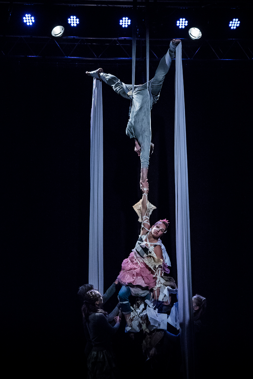 Akoreacro’s, Dans ton coeur–this French/Spanish collaboration stands out with its representational narrative about a young woman and her thoughts/fears, personified by the all-male troupe of porters. There is an inventive flow of time as we watch her life, along with her husband, the only other character, acrobatically unfold. We go through courtship, marriage, children, her husband’s affair, (portrayed by a humorous cradle act, with the base in drag) all while persistently haunted by her fears. Ending in the inevitable clash where she physically and psychologically beats them and emerges victorious.