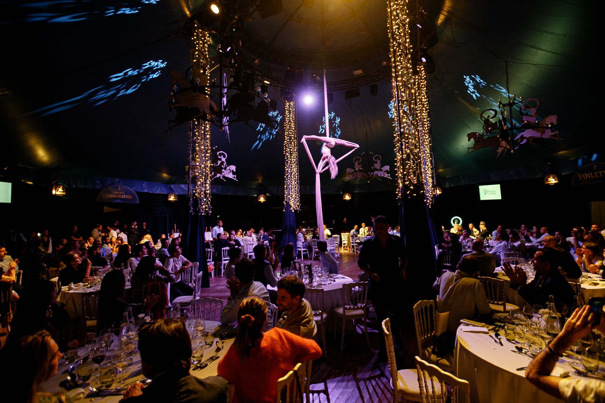 The Folies Grüss are located at the edge of the Bois de Boulogne, west of Paris, on a vast plot that looks like a clearing. For several seasons now, the Grüss family has built out the concept of the Folies Grüss as an immersive experience that unfolds over three sequences within an equestrian, musical and acrobatic universe. A tent village installed for several months a year becomes the setting for a dinner full of attractions, a complete show, and a time of conviviality at the end of the performance. It is the “Grüss blue,” a color that has long been privileged to decorate the company trucks, the canvas Big Top, and the curtains, drapes and ceilings, that dominates the place and makes it feel both elegant and warm.