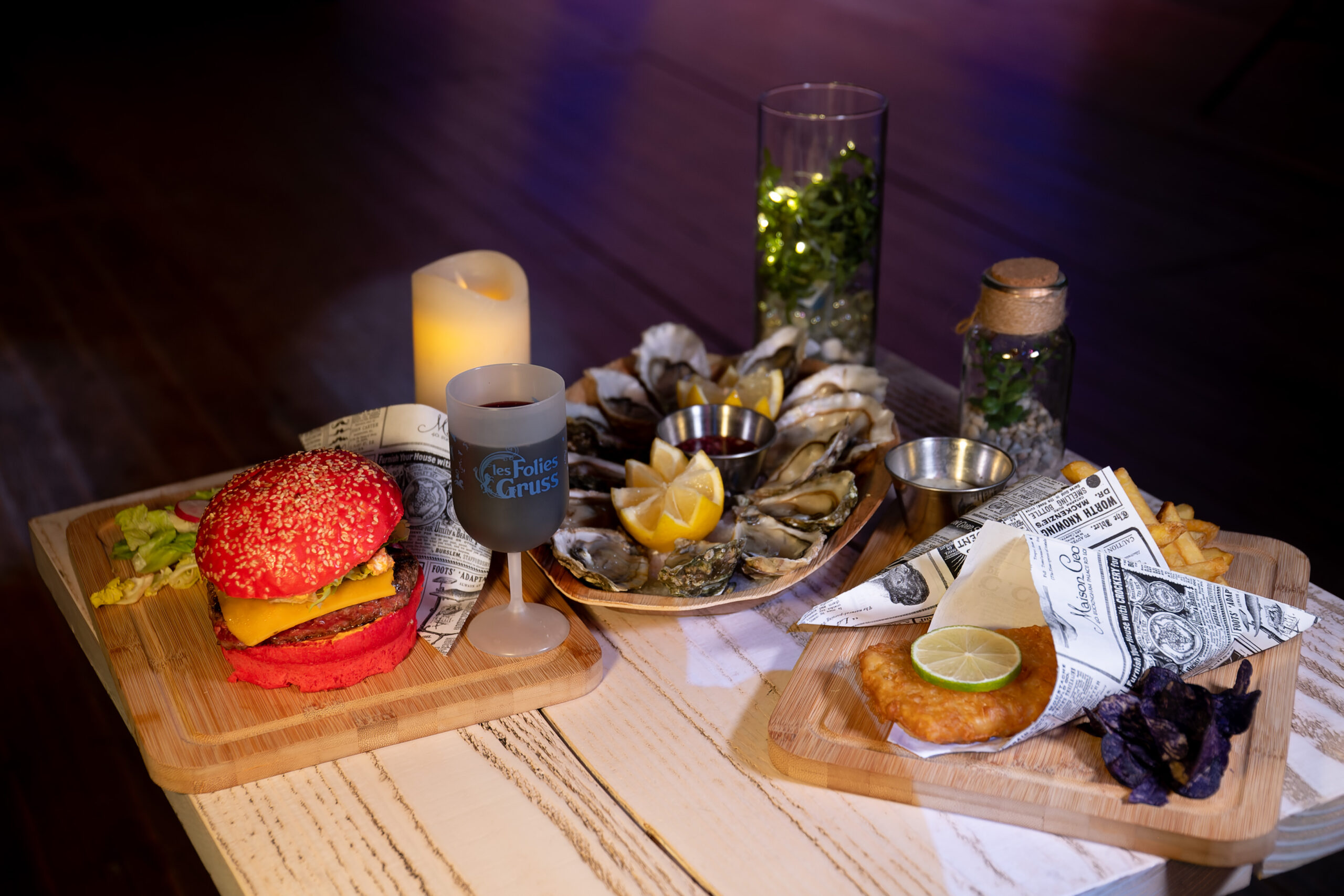 Lunch or Dinner is a real and charming prelude to the main show where guests gathere around trays of oysters; burgers that look like deep red mushrooms; or excellent Fish and Chips, accompanied by musicians and a singer. This food tasting is also punctuated by acts offered by the members of the troupe. The festive ambiance conditions the spectators to appreciate the show to come.