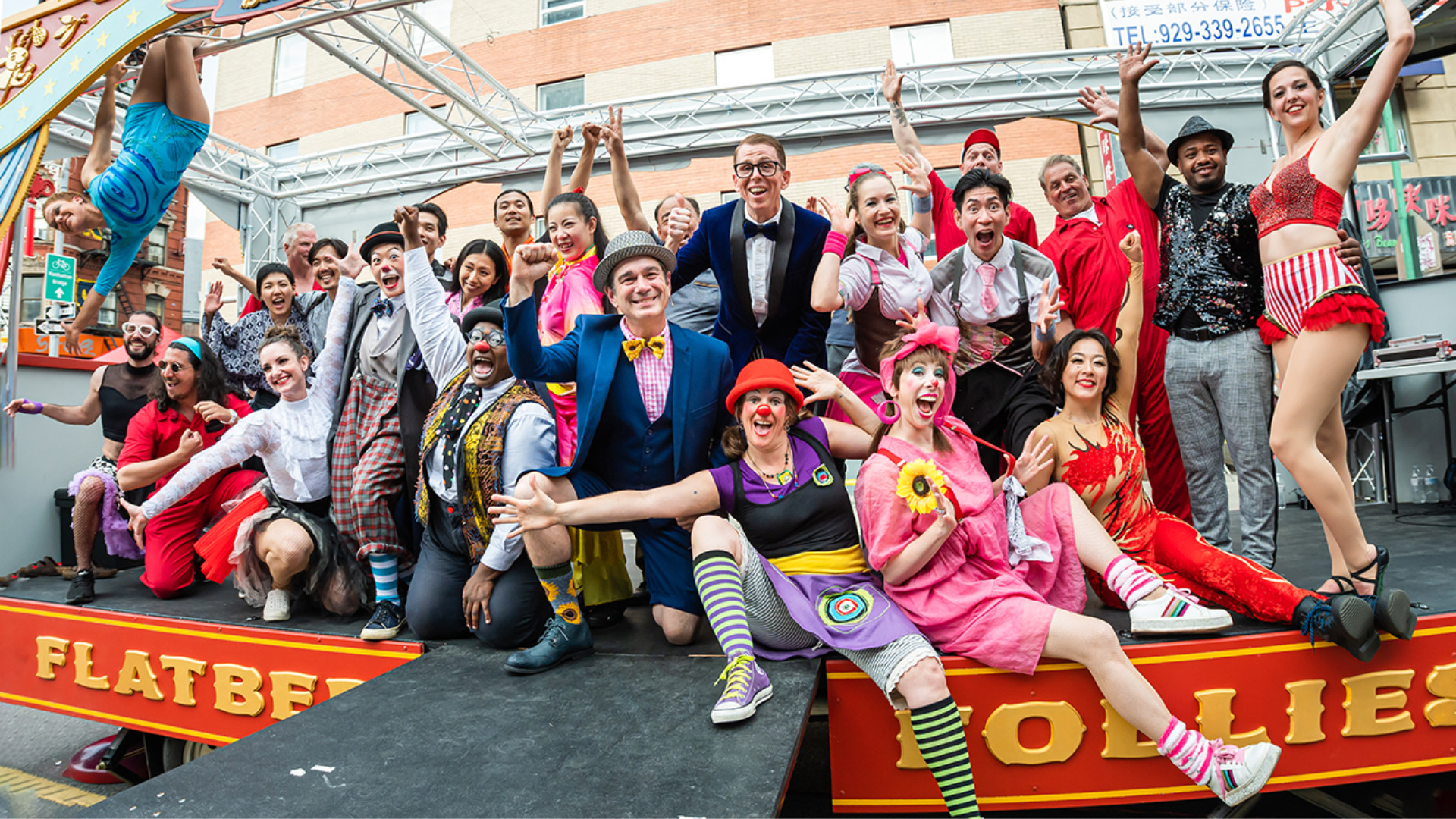 in 2022, New York City’s premier variety arts ensemble, the Bindlestiff Family Cirkus, brought Flatbed Follies to neighborhoods across all five boroughs of the city. Presented on innovative flatbed trailers adapted into mobile venues, Flatbed Follies enabled audiences to experience an incredible and eclectic variety of talents including clowns, jugglers, aerialists, wire walkers, musicians, magicians, puppeteers, dancers, as well as a calliope wagon playing authentic circus music. Working with the NYC Department of Transportation, Bindlestiff’s Flatbed Follies brought the grand spectacle to the Open Streets and Plazas of the city.