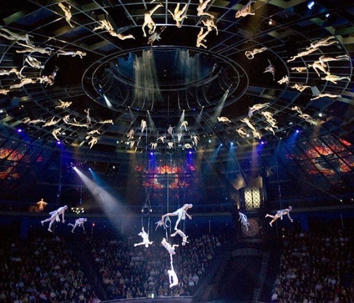 For the circus community in Las Vegas, production shows carry a prominent corporate structure based on the glamorous and conglomerate casino resorts they reside in. Having a more technically advanced stage and/or automated flying systems in grandiose rooms can result in added safety conversations that may not be had in smaller productions. These initial conversations often stem from a legal and liability perspective, but often become normalized with the goal of rehearsing them regularly so as to remain prepared in a worst-case scenario. Aerial rescue training is common within huge production shows but far less common globally in more traditional-styled circus shows and, even more so, for tent shows.