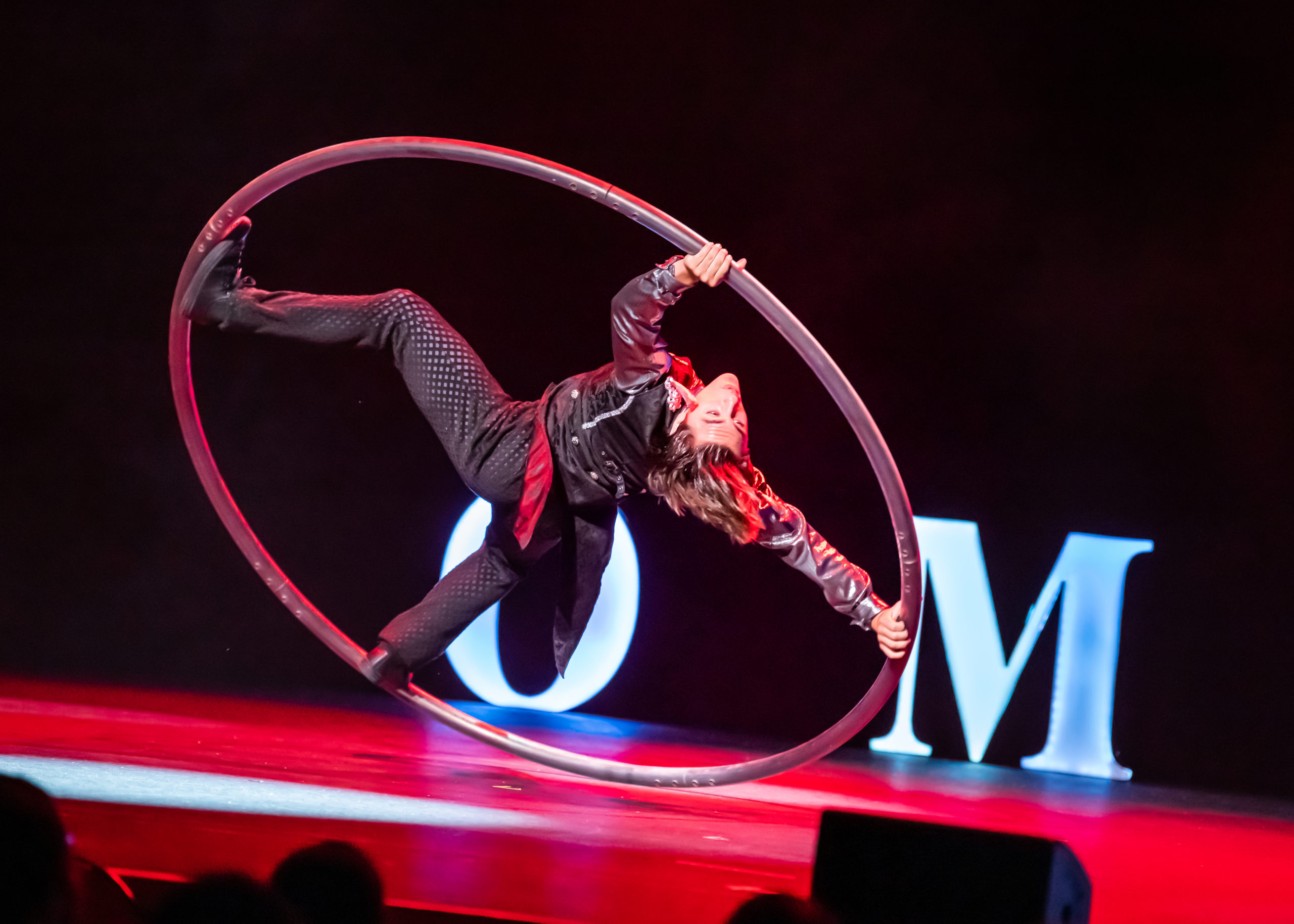 All that said, I feel that to deliberate on the upper limits of circus (if there are any), the question of “how much is too much” or “how little is too little,” is to miss the point of Omnium Circus entirely. Maybe there’s not always a ton happening at once—but all the same, there’salways something happening to keep people engaged. After the dog act, the stage lights go dark as stagehands clear away the hoops and hurdles… and in the same instant, a spotlight shines down on Rob Lok, who has popped up in the front seats with his heart-shaped boxers showing. Later on, Elan Alex España stumbles out of the cyr wheel during his solo act— but then we all start clapping louder for him (yes, even that kid in front of me), and Elan picks himself up, and gets straight back into the wheel like nothing ever happened. It all went so quickly, and with such showmanship, that I honestly can’t tell if the moment was choreographed. Yet it made the point more clearly than any other moment in the show’s narrative:nothing is impossible, even if you stumble on the way to reaching it.