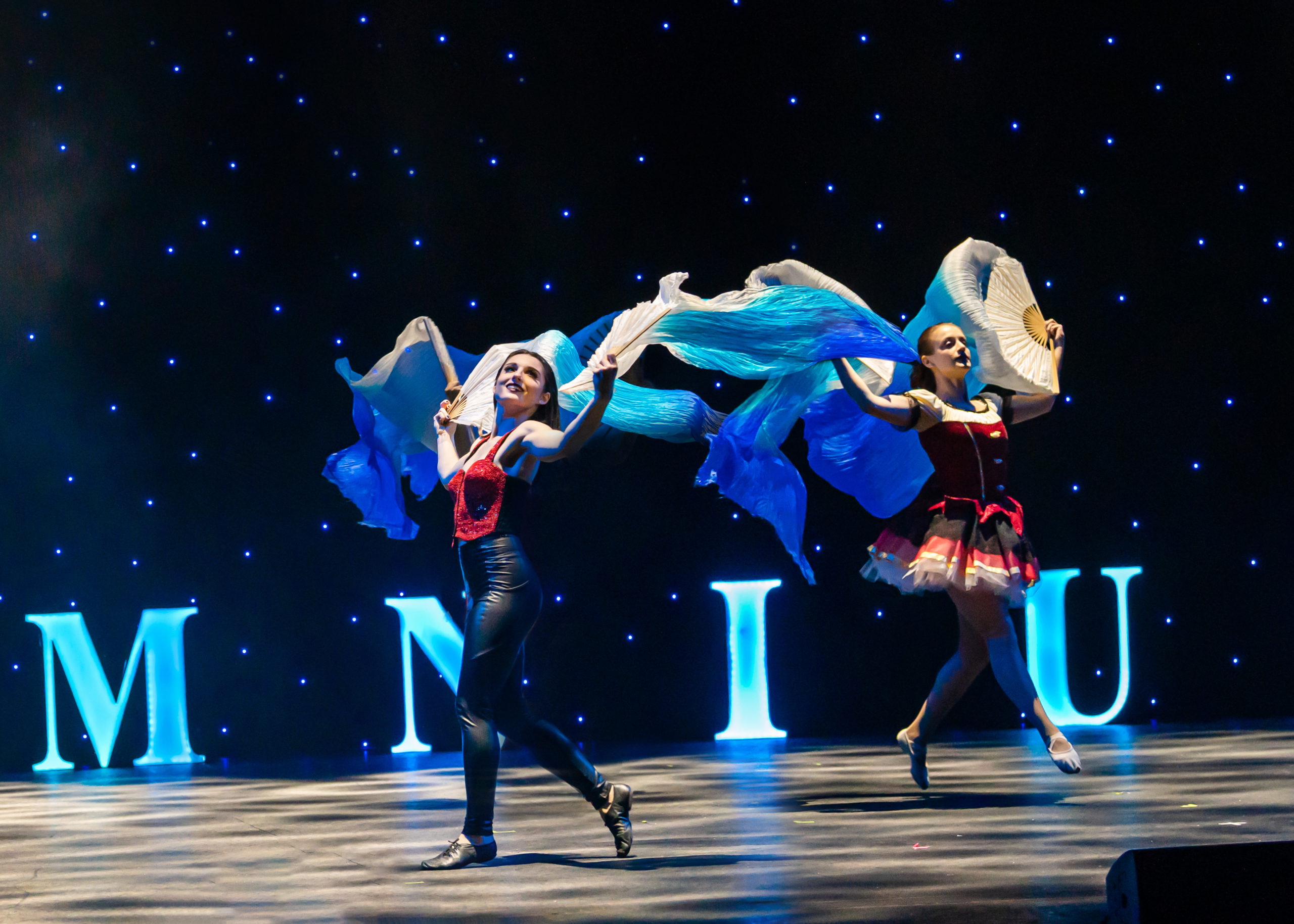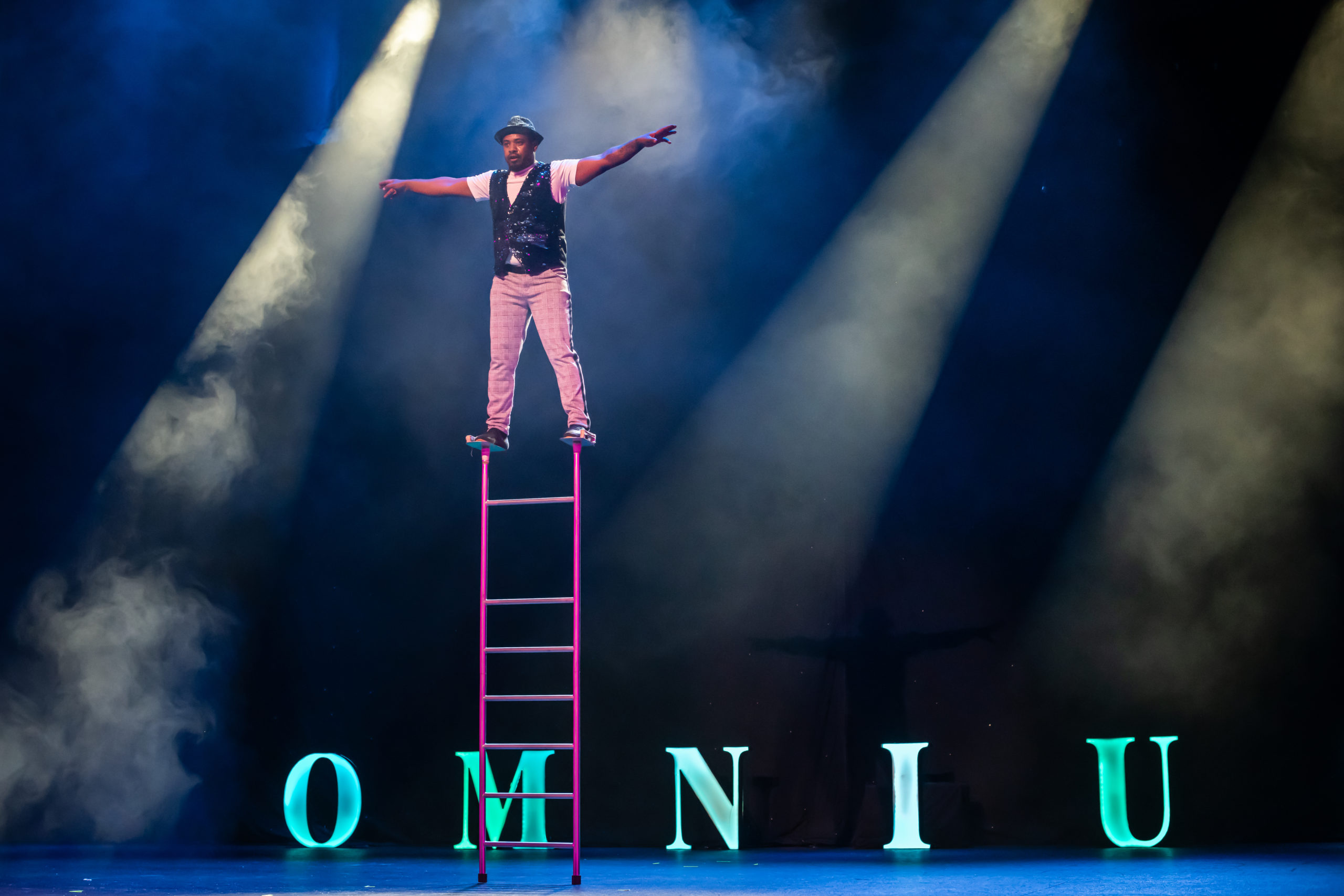 A minimalistic set and sound design help keep the audience’s focus on the performers. The backdrop is a shade of gray, and a thin, ever-present fog hangs over the stage throughout, making the glare of the lights hanging overhead less harsh. Another constant set piece: the word “OMNIUM,” again, is spelled out in lit-up, color-changing 3D letters spaced across the stage floor. The hanging lights change color, too— but in both cases, the shift is gradual and rhythmic, rather than a strobe effect, which might trigger sensory overload or seizures in a sensitive audience. As well, there isn’t much noise to compete with: aside from Johnathan’s occasional narration and nonverbal banter with Anna, none of the acts or scenes have any dialogue, and wordless music surges to match the speed and intensity of the performances.
