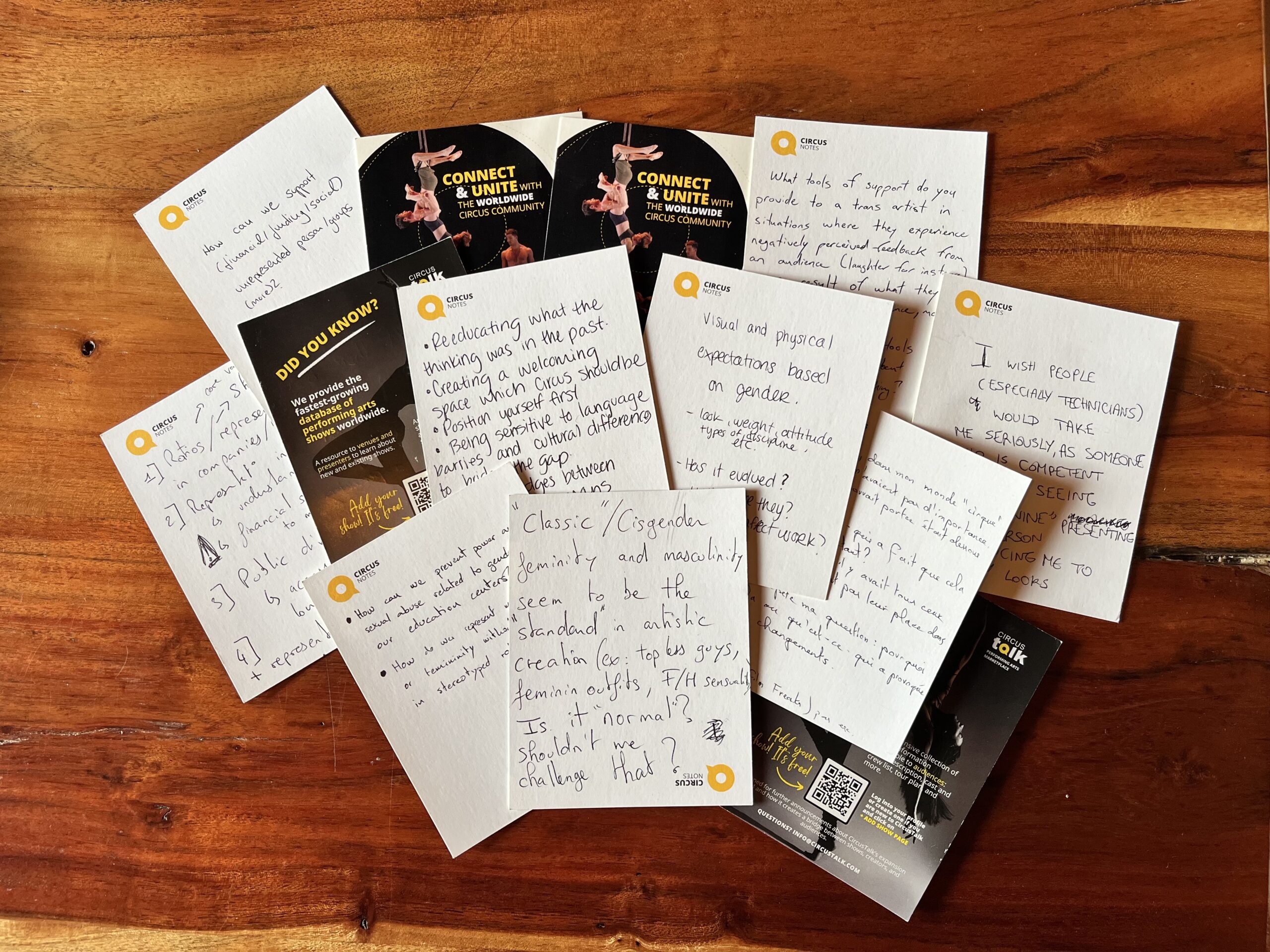 The goal of this PRO Talk was to create a space where people of all identities, cultures and roles within the circus arts could feel comfortable voicing their thoughts and questions about gender in circus. In pursuit of this, participants were asked to anonymously write down a thought, question or experience regarding gender in circus and hand their card over to Diana and Stacy for collection. From there, four small groups were formed, (the fifth composed of the Zoom attendees), and given three random cards from the collection to consider and discuss. After twenty minutes of conversation, a representative from each group shared a summary of their group discussion.
