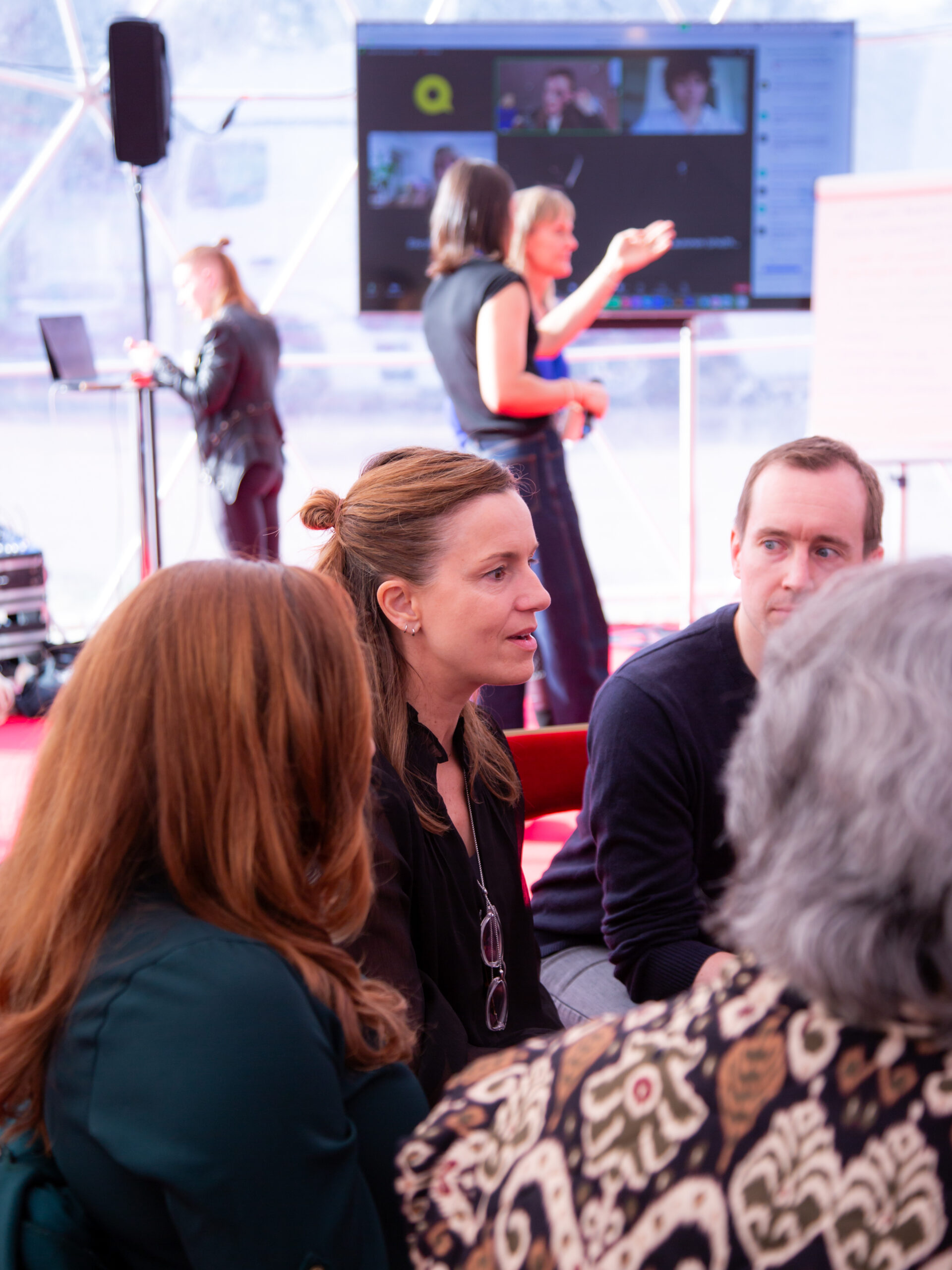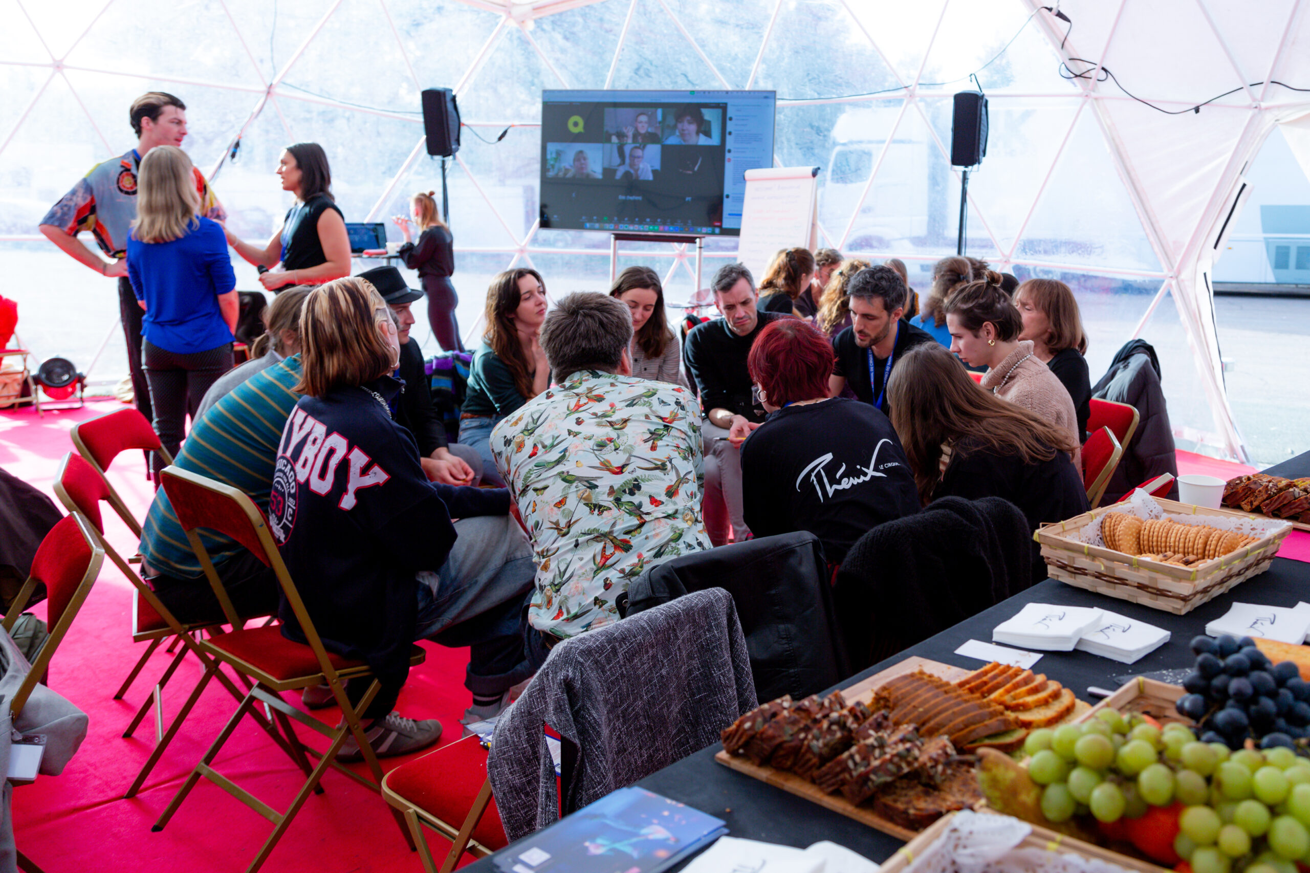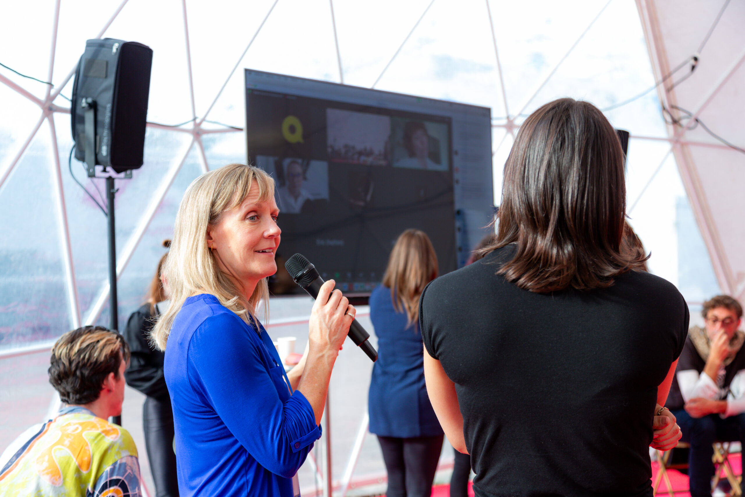 Despite the chill outside, it’s actually pretty warm in the dome! The space hums with the curiosity and eagerness of almost 50 attendees, both in person and on the Zoom call being projected at the front of the room. One of these Zoom participants has even tuned in at 3am their time to participate! As everyone sheds their coats and settles into their seats, Diana Salles and Stacy Clark switch on their mics and begin the discussion by setting the tone… “Let’s just be awesome people. This is a space for everybody.” And the conversation begins.