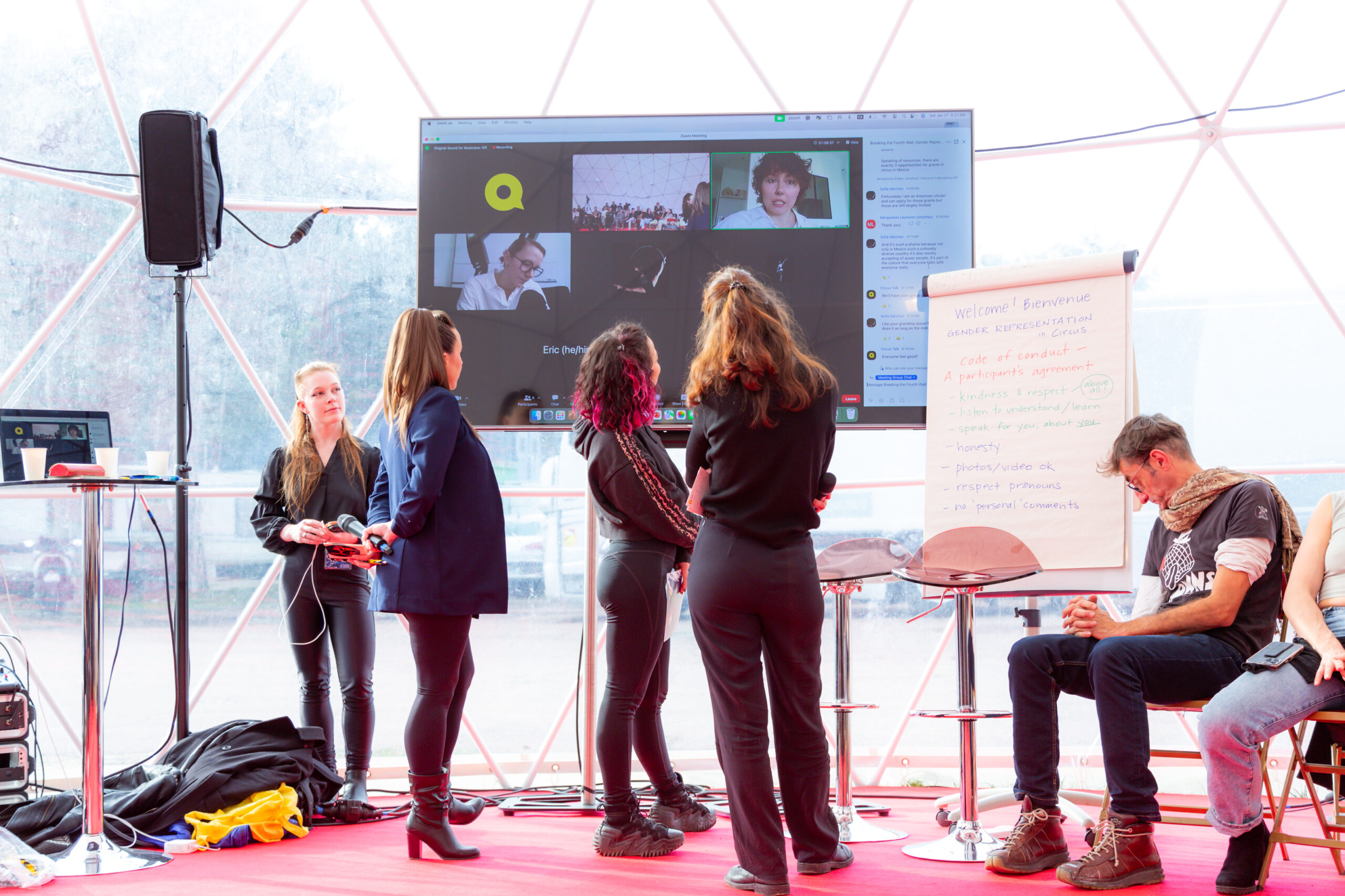 Let’s set the scene. It’s a frigid Saturday morning in Paris, January 27, just past 11am. The 43e Festival Mondial de Cirque de Demain is in full swing, but the Cirque Phénix lobby is rather quiet, scattered with only a few people compared to the masses who will attend the spectacular performances later in the day. Those in the lobby are making their way outside to the Club PRO dome with purpose. Today, they’ll be active participants in the first ever gender-focused roundtable discussion in Cirque de Demain’s workshop series.