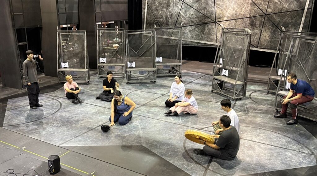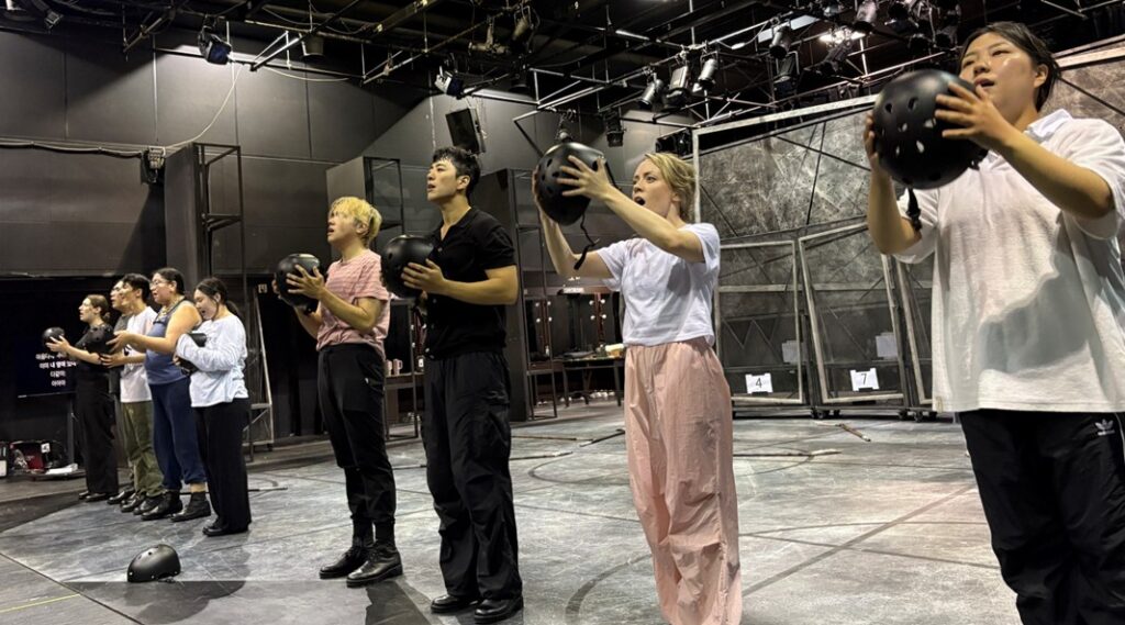 The playwrights would write new text, which various members of the creative team would then translate into Korean and/or English overnight. This material would then be explored, elaborated or refined by director김가람 Kim Ga-ram and the performers the next day, leading to an ongoing, evolving, and holistic process. New discoveries in the rehearsal hall such as adding a new language to a song or developing a new multilingual path for a dialogue or scene would lead to the next round of creation and translation.