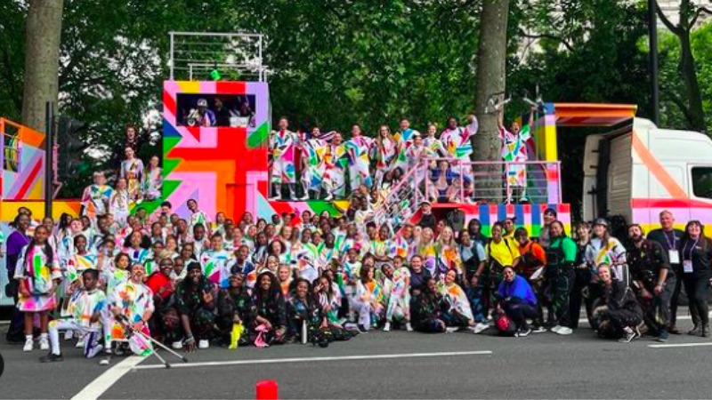 The deconstructed Union Jack x Pride Flag design on the float was by Julian Bracey with Bristol street artist Zoe Power.