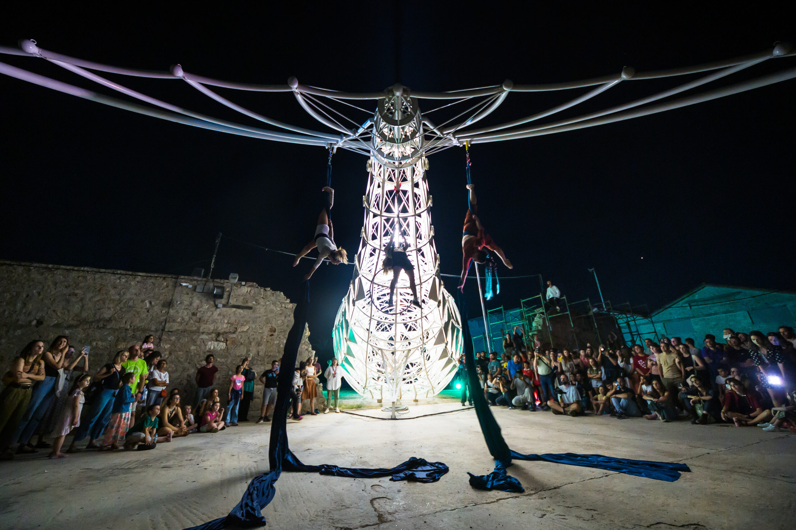 We have finished the first part of our project, which was set in the Greek town of Elefsina. This is a city with heavily industrialized spaces and only a few parks. Residents were often skeptical about performing in public spaces, and most have never seen a site-specific circus show before. However, we presented five shows in the tight frame of eight days. Each show was different in style. For example, there was a “live museum” show, an event where circus artists created “motion pictures”; their solos and duos in interaction with the space were scattered throughout the venue, and spectators could walk around freely and marvel at them. Another show was connected to the inauguration of a playground. The full-on final show was a large-scale spectacular in which we incorporated all the buildings and sculptures surrounding us with wall dance, fire, acrobatics, and much more.