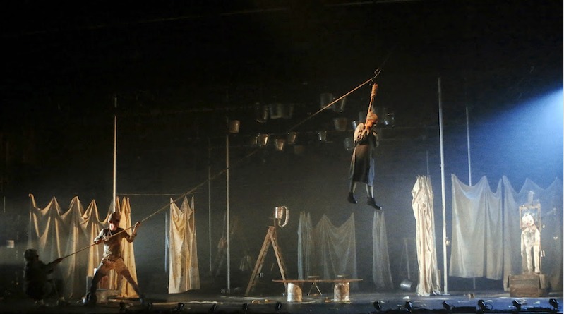Three clowns with black noses dominate the stage, busily manufacturing misery. Their monochrome world is colored only by two things,