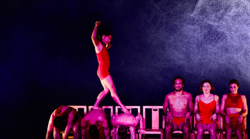 Seven acrobats in red fly across the stage, prop each other up, climb atop a tower of their kin, play