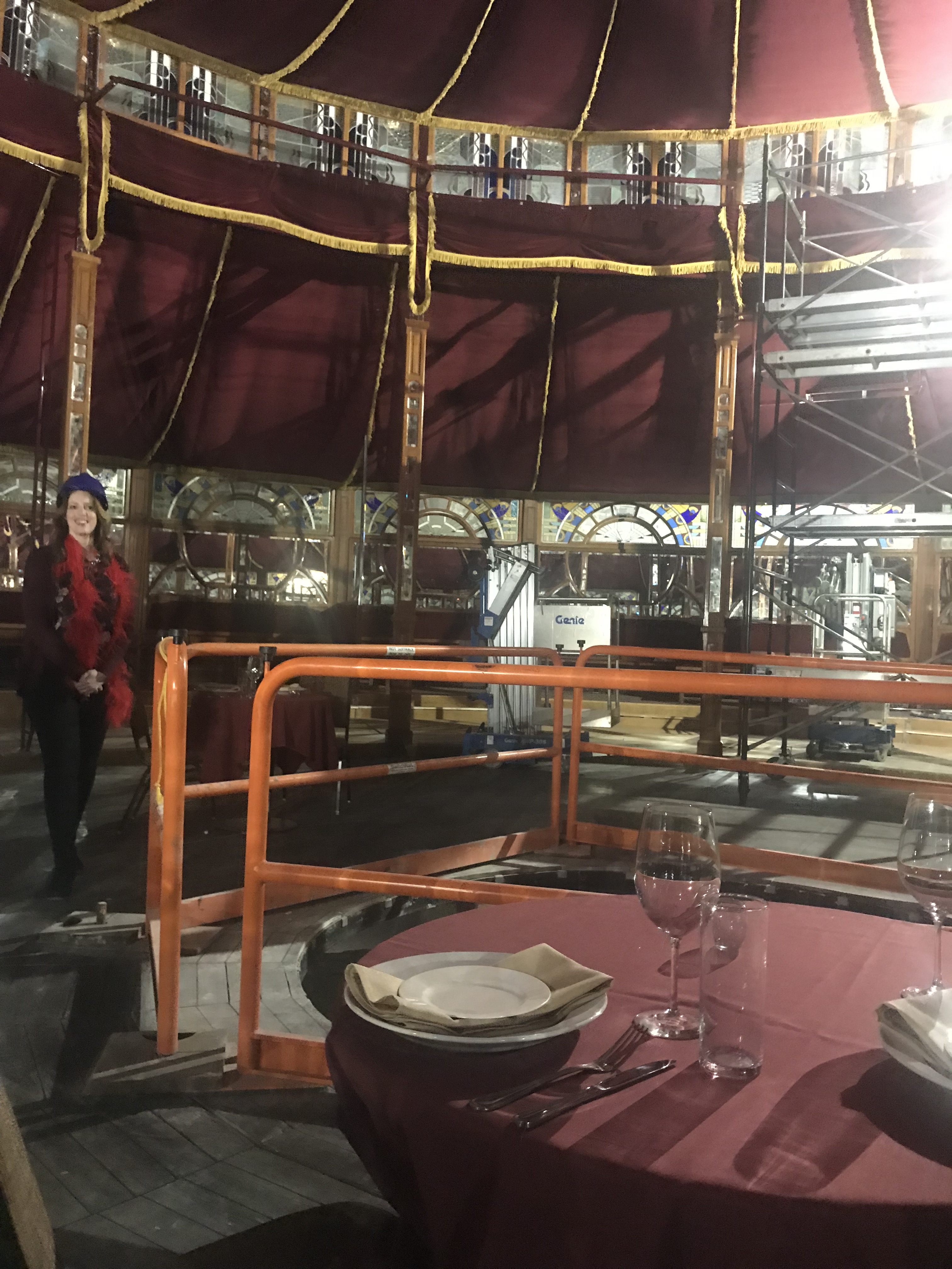 In early April the local Chicago arts press was invited for a ‘hard hat tour’ of the still under construction Teatro ZinZanni venue in the Chicago loop. The sneak peek was to strike up curiosity about the newest thing in town, an old Belgian Spiegeltent, which will house a raucous yet high brow evening of entertainment–a four course meal and variety show titles Love, Chaos & Dinner at the top of the Cambria Hotel (in a space sealed off since 1026 and forgotten) in Chicago’s loop theatre district. Teatro ZinZanni, which was founded over 20 years ago in Seattle by Norm Langill (also creative director) has been searching for a location in Chicago for over 8 years, according to lead producer Stan Feig, “It’s taken this long to find, but Chicago was always the main choice,” he assured me after the hard hat tour.