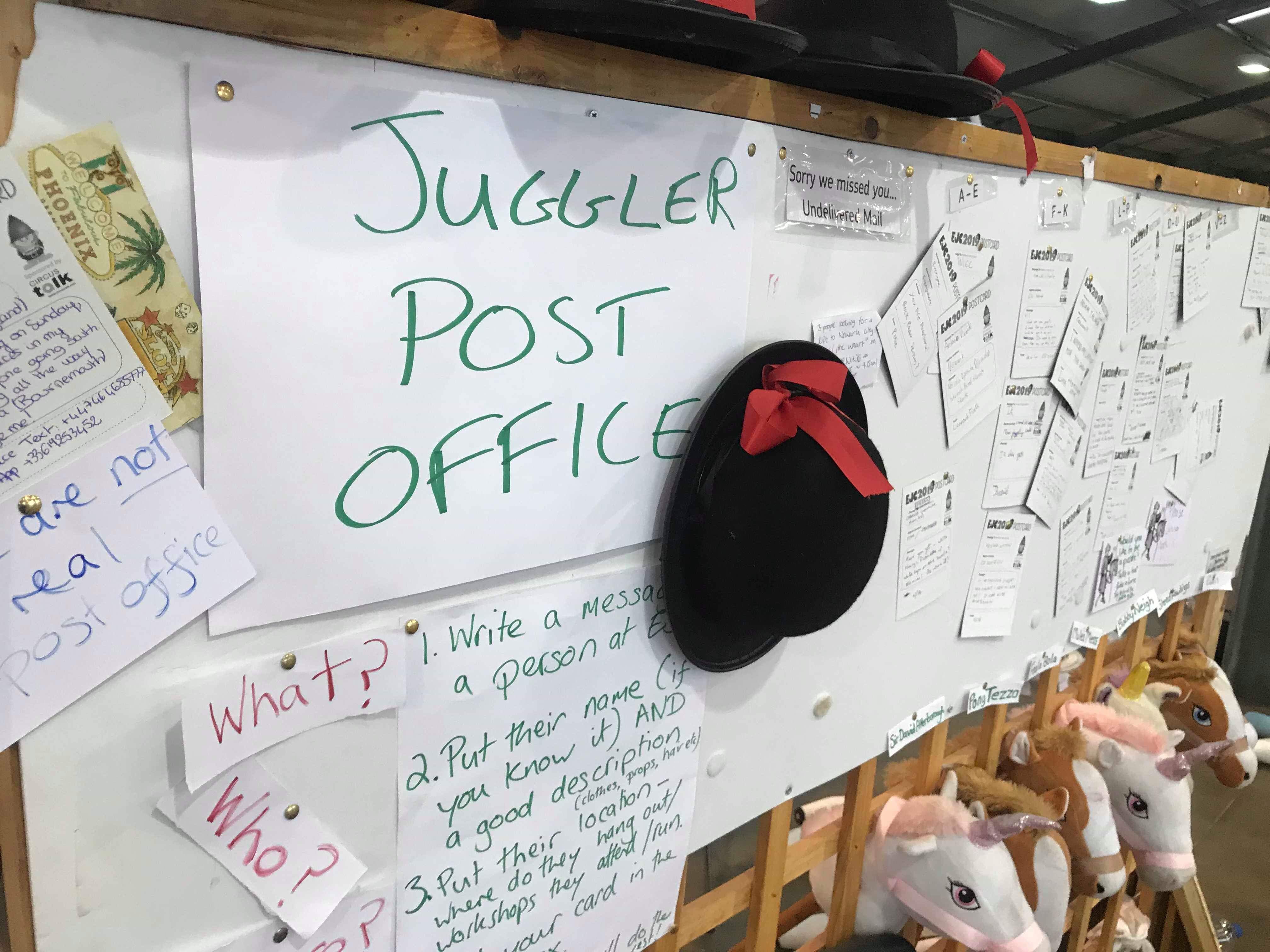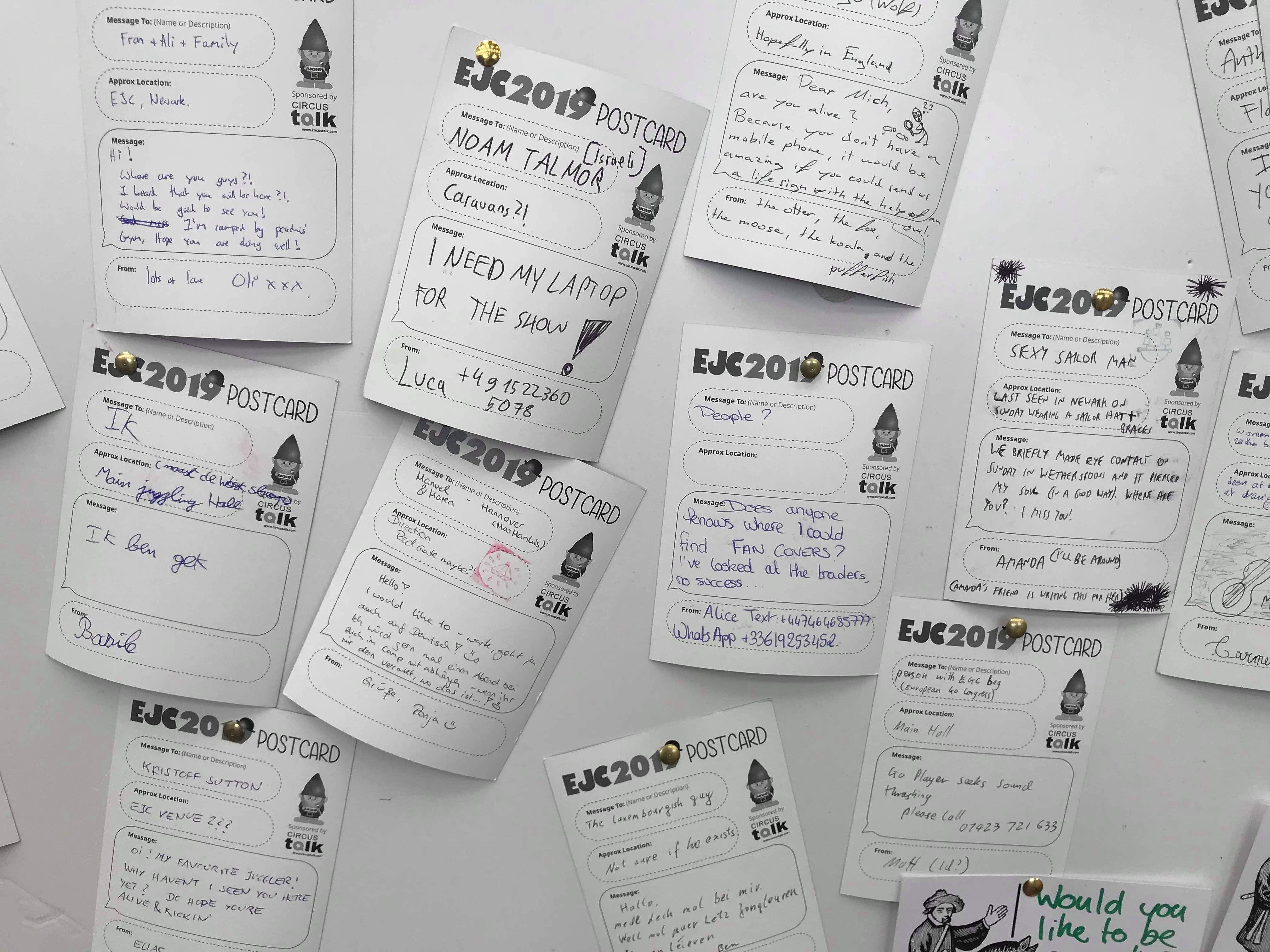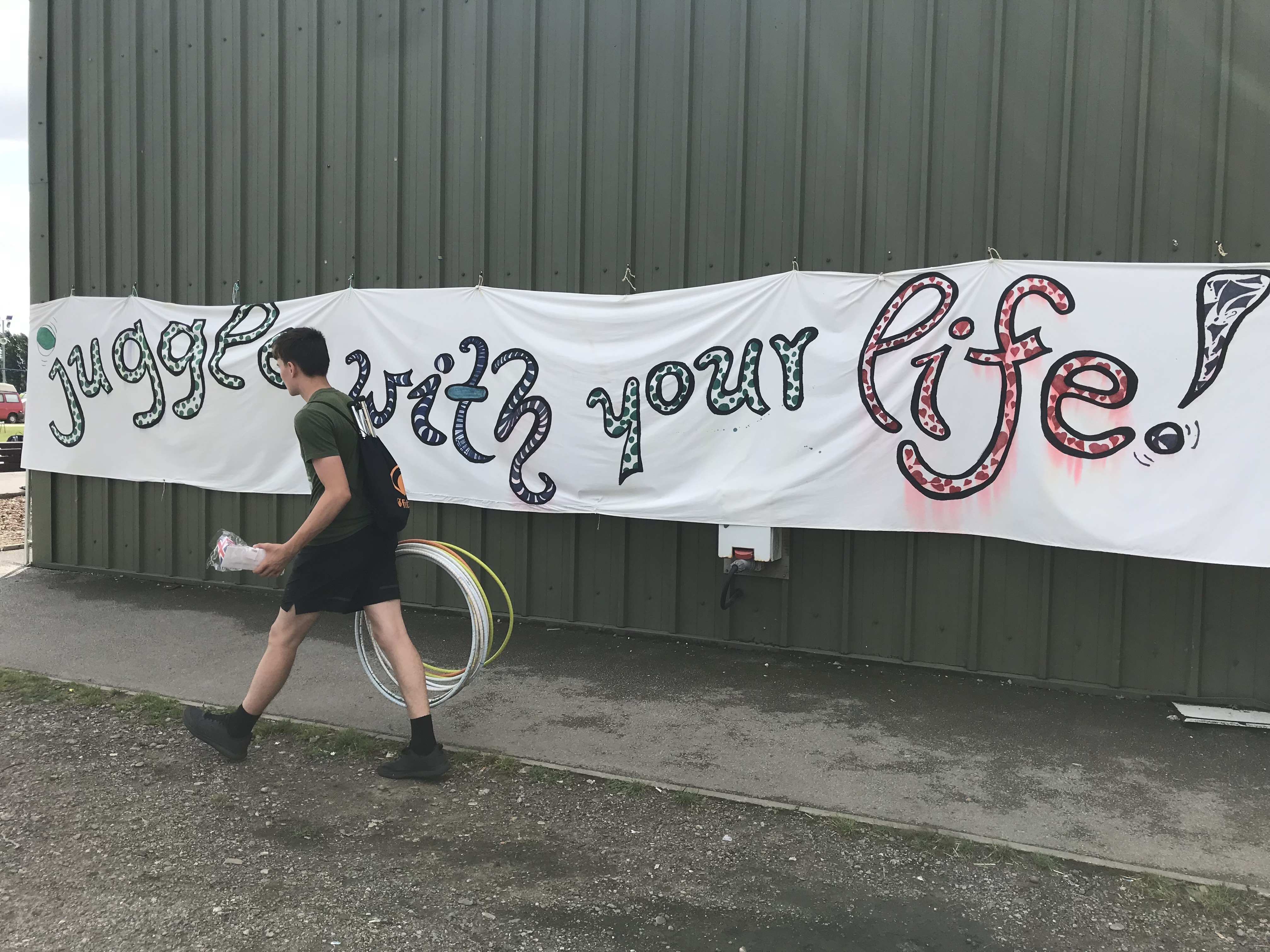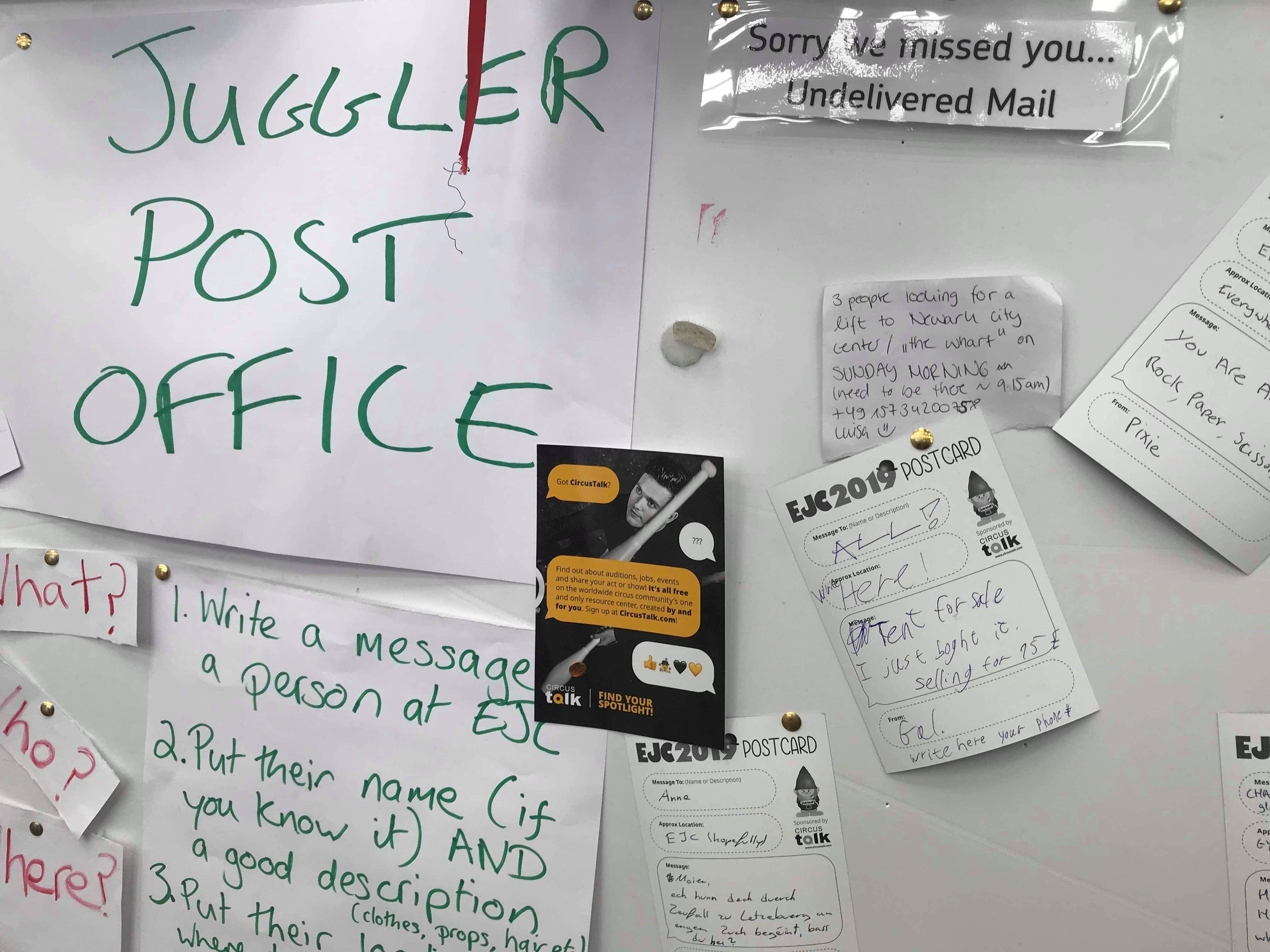 This year (Aug 3-11, 2019) it was held in the United Kingdom and editor Kim Campbell braved the high winds to pop in for a few days to volunteer, to see some juggling shows, meet the vendors and to get the lay of the juggling landscape. Did she juggle? Not as much as she wanted to! But she enjoyed being part of the giant worldwide juggling community gathered in one place and taking many, many photos of all of the exciting competitions, practices, and shows. CircusTalk was honored to sponsor this year’s EJC postcard game which helped jugglers from all over the world connect during the big event.