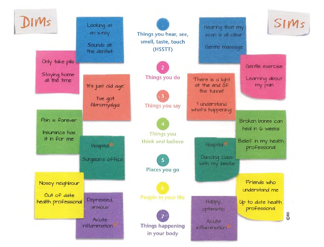Try to do this exercise right now. If you are experiencing pain, try to write down everything that might be influencing your pain. It’s sometimes quite hard to find where DIMs and SIMs are, especially if you haven’t ever thought about it deeply.