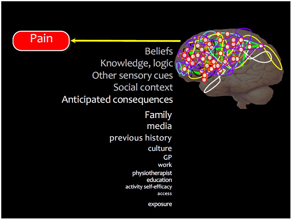 That being said, we’re not trying to say that your ‘pain is all in your head’ and that you should ignore it. The take home message is that pain is experienced and felt at different intensities and nuances according to several other factors including: beliefs, thoughts, knowledge, feelings, friends, colleagues, community, culture, inflammation, tissue pathology, genetics and many more factors.