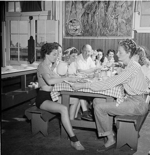 Heidi Connor, Chief Archivist at The Ringling has several remarkable photos of Mrs. Jacobs. In one, Jean is enjoying lunch with general director of performance, Pat Valdo and a group of performers in the cafeteria at the Winter Quarters in Sarasota, Florida, 1952. This photo was taken by Stanley Kubrik while on a photoshoot for LOOK Magazine at Winter Quarters shortly after Jean joined the circus. The other photo, dated 1975, is a Ringling Bros and Barnum & Bailey Circus promotional shot of the entire Jacobs family in the circus ring – Knucklehead the dog, Lou Ann, Dolly, Lou and Jean. These images are held in the Archives of the John and Mable Ringling Museum of Art, Personal Papers of Bill Ballentine, 1911 – 1999. Connor remarked, “Reaching out to the circus community, everyone‘s first comment on Jean is how nice and gentle Jean Rockwell Jacobs was – just a great person.”